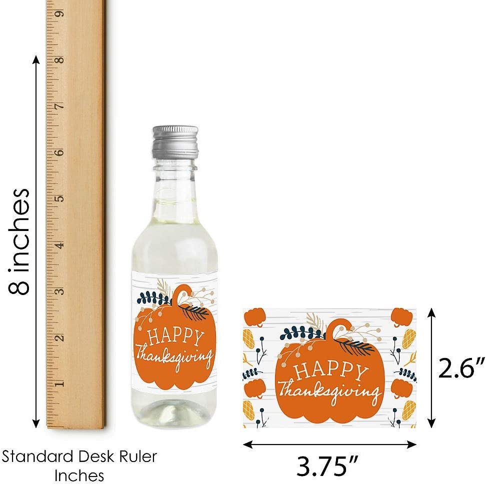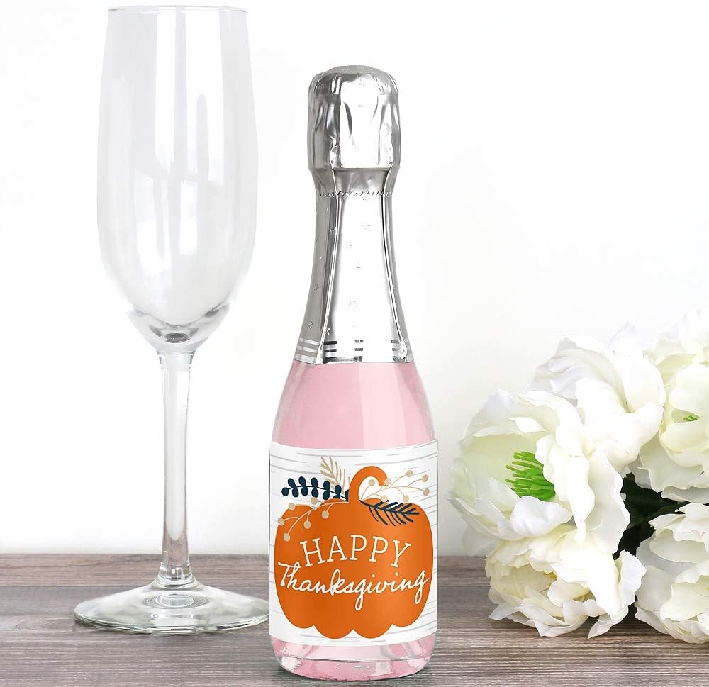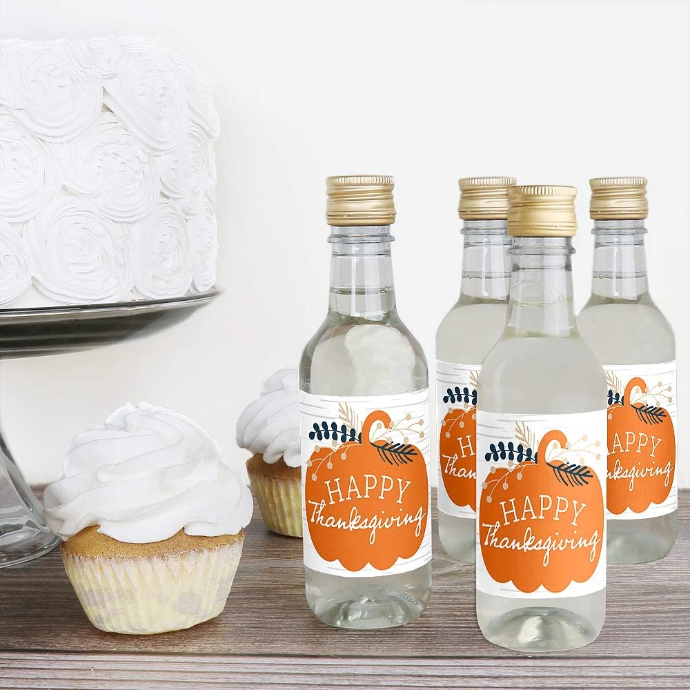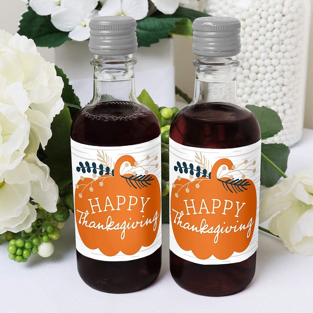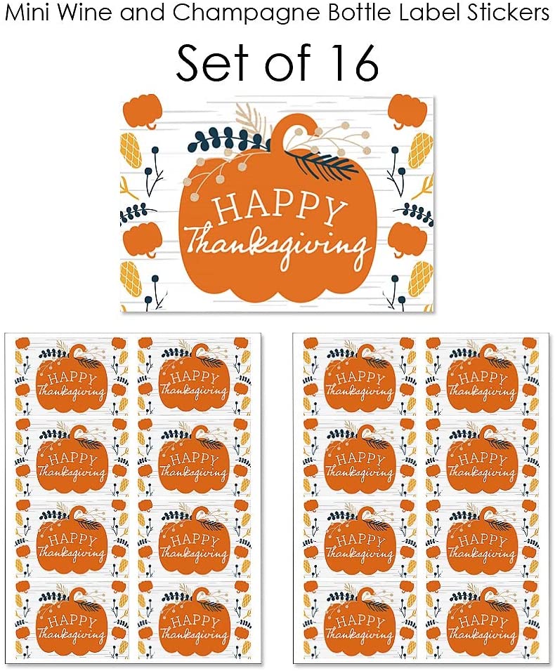 • Happy Thanksgiving Mini Wine and Champagne Bottle Labels INCLUDES Set of 16 pumpkin single-serve bottle sticker labels in the Happy Thanksgiving theme, perfect for a fall harvest gift.