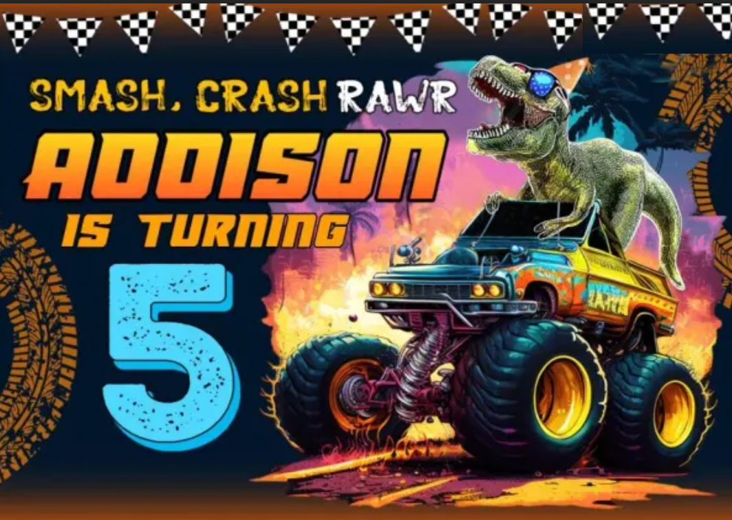 Monster Truck - Birthday Dino Monster Truck Backdrop - Custom Name and Age - 60x40 inch is backordered and will ship as soon as it is back in stock.