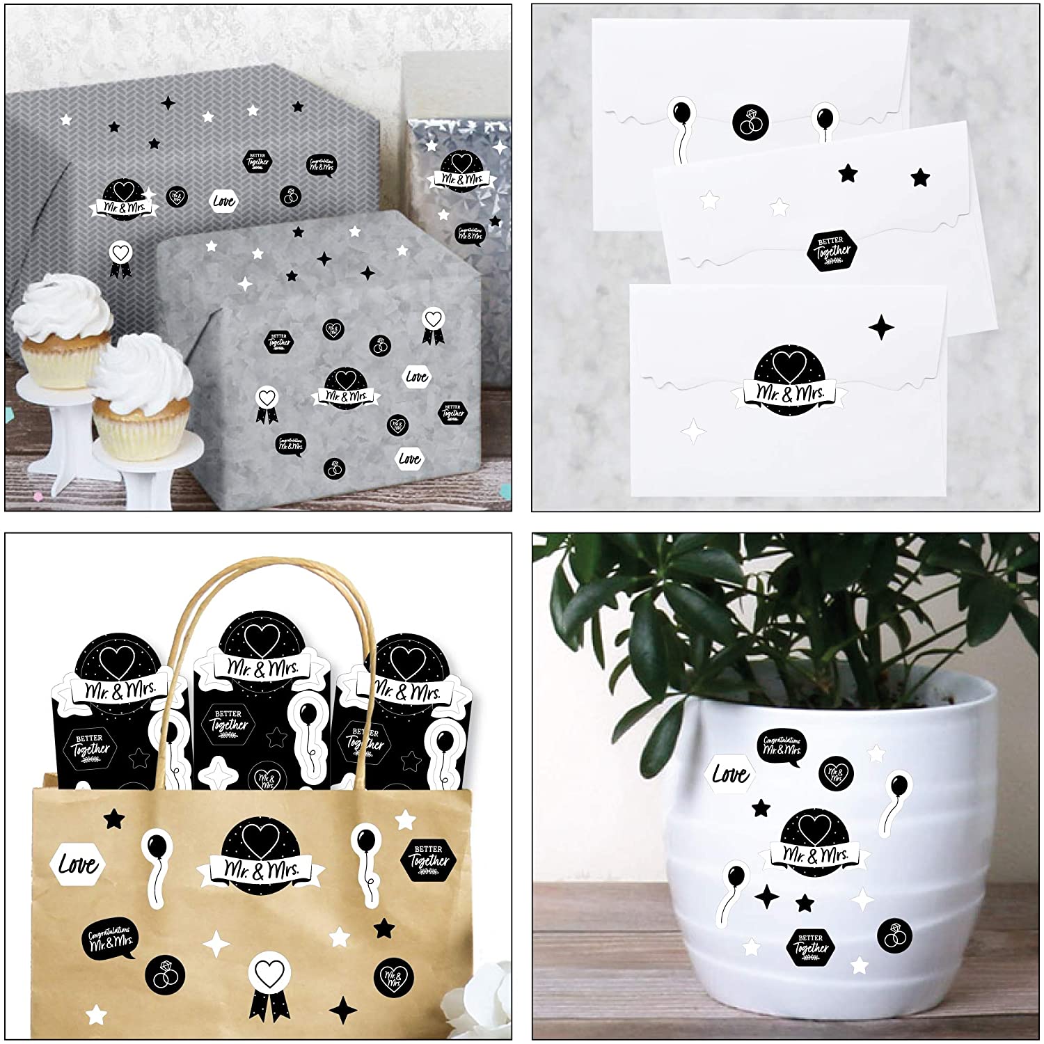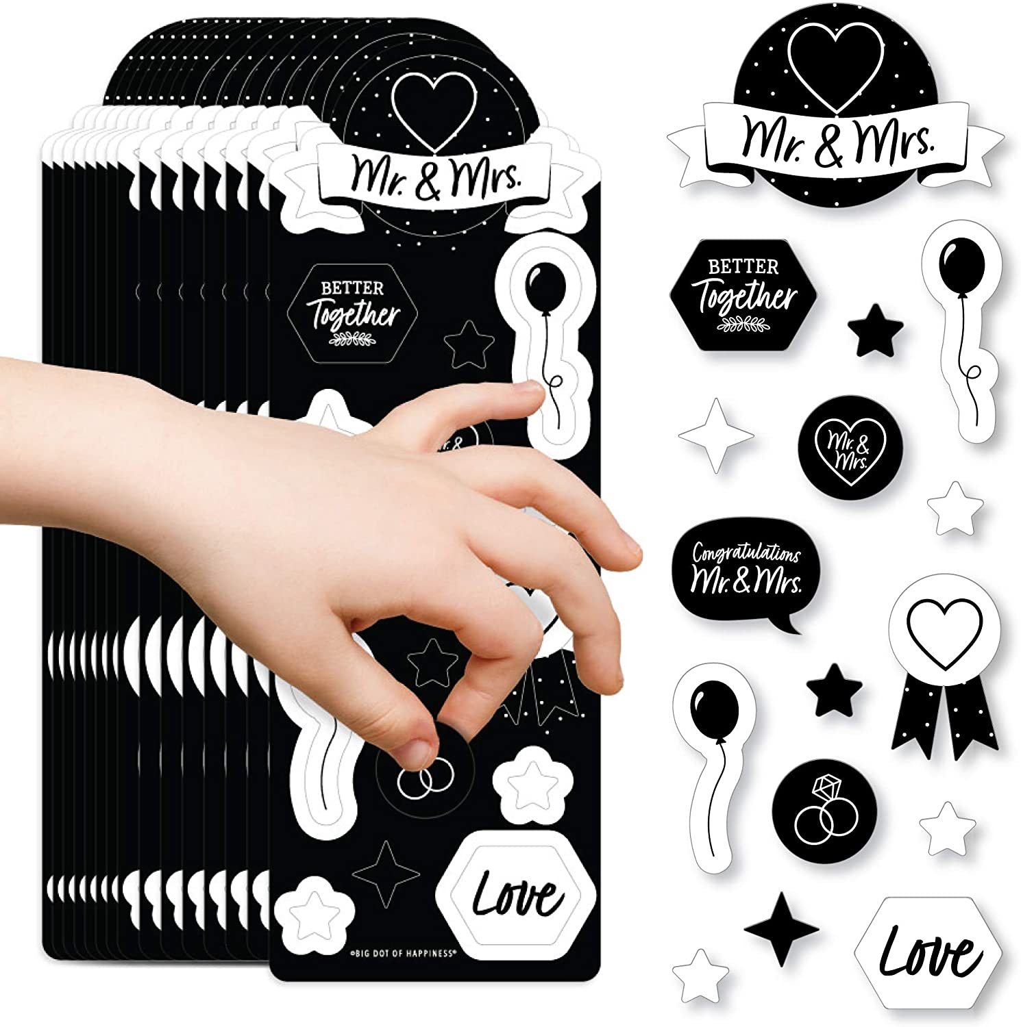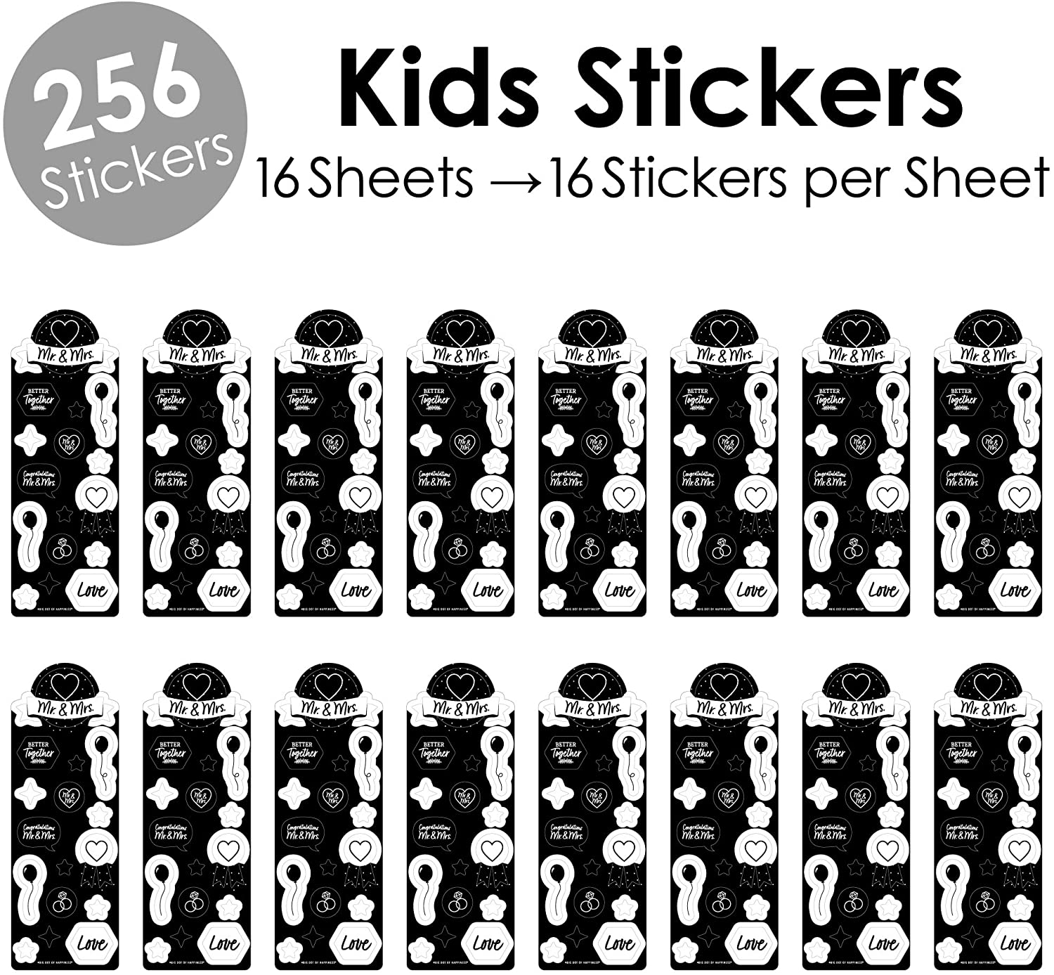 Mr. and Mrs. - Black and White Wedding or Bridal Shower Favor Kids Stickers - 16 Sheets - 256 Stickers is backordered and will ship as soon as it is back in stock.