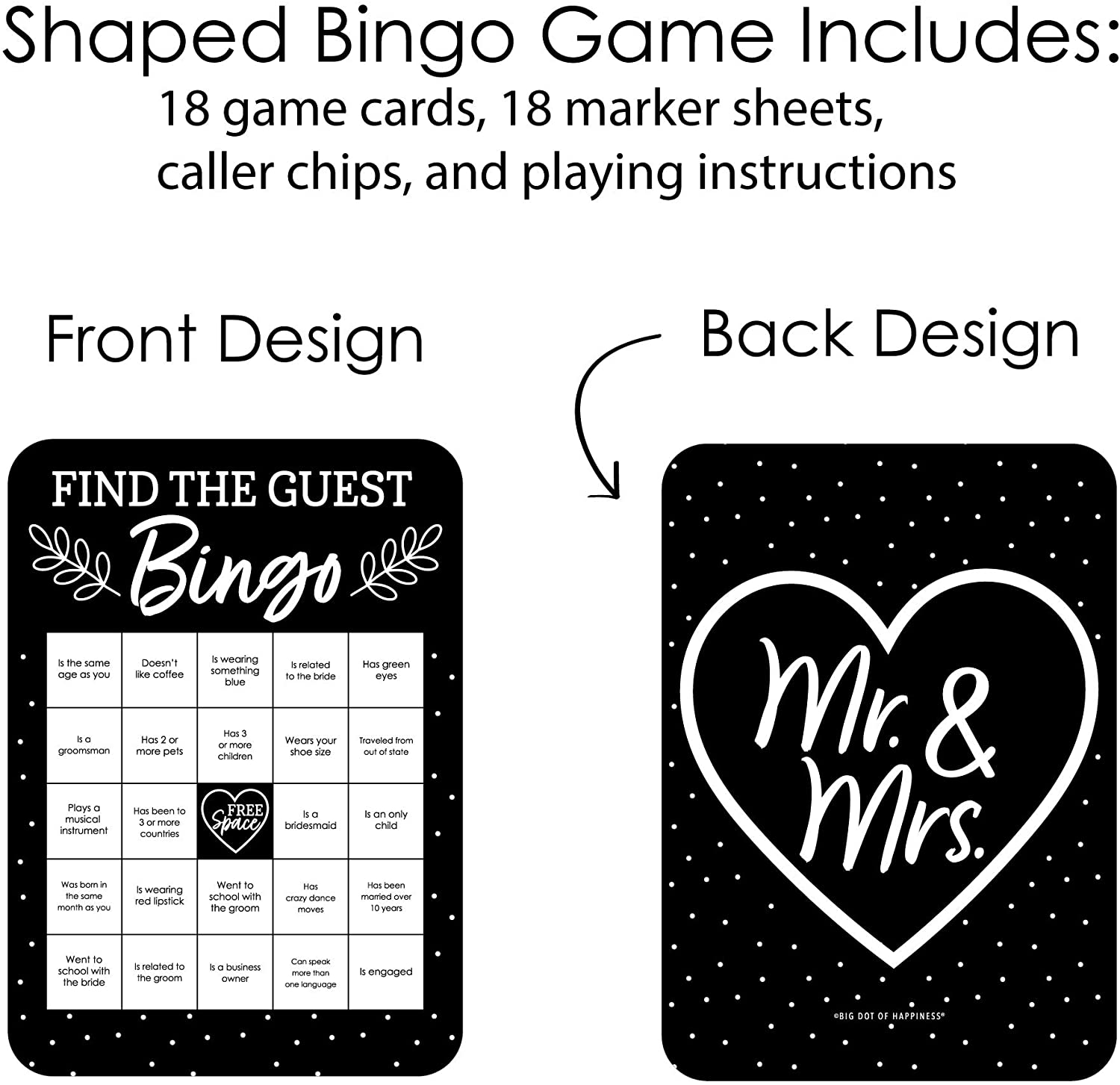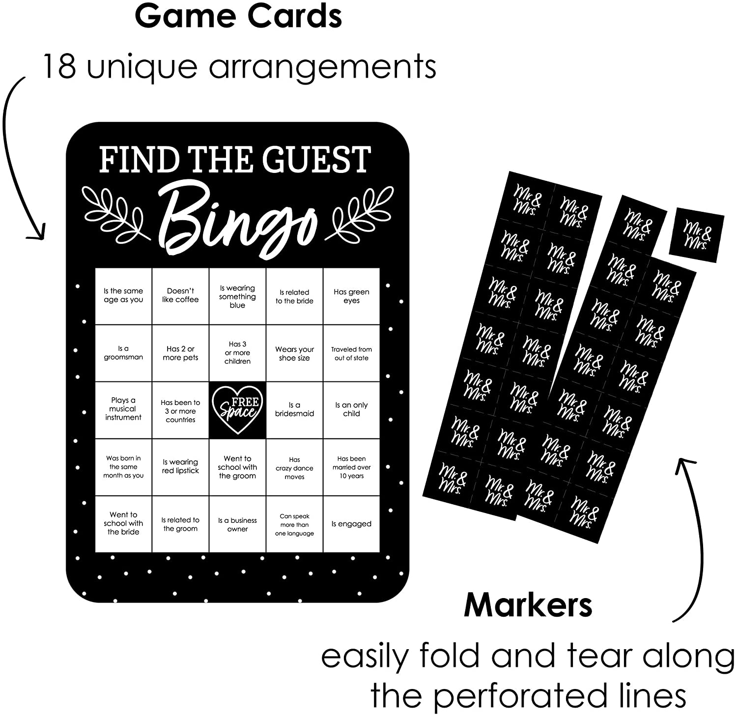 Mr. and Mrs. - Find the Guest Bingo Cards and Markers - Black and White Wedding or Bridal Shower Bingo Game - Set of 18 is backordered and will ship as soon as it is back in stock.