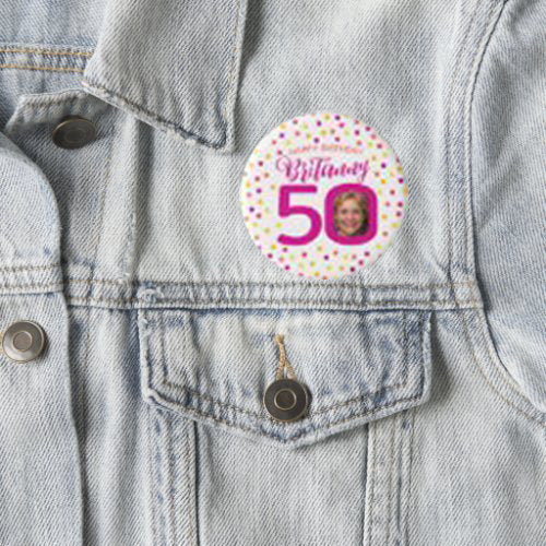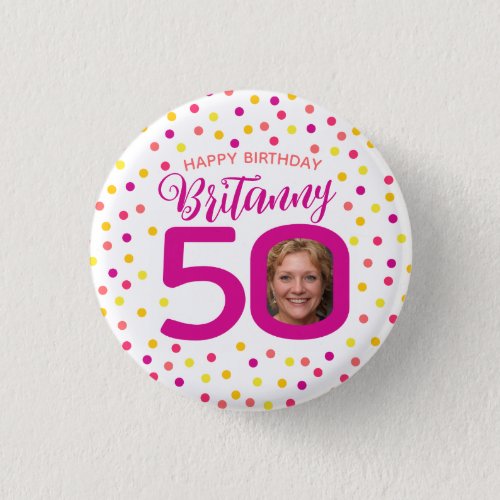 50th birthday photo pink golden yellow confetti 3 Inch Round Button - SET OF 8 is backordered and will ship as soon as it is back in stock.