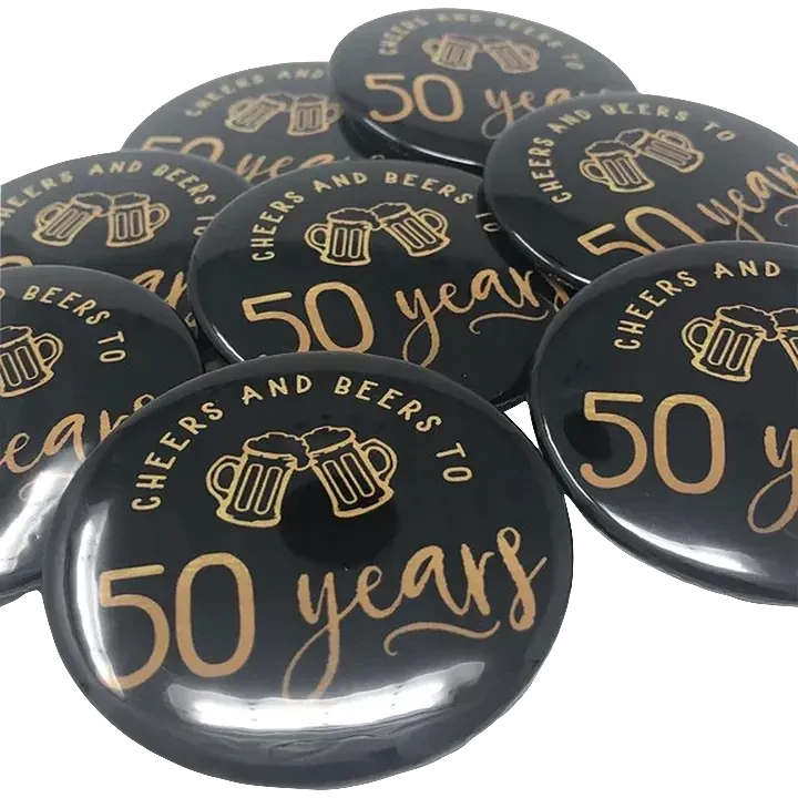 Cheers and Beers, 50th Birthday Button 3 Inch - 1 is backordered and will ship as soon as it is back in stock.