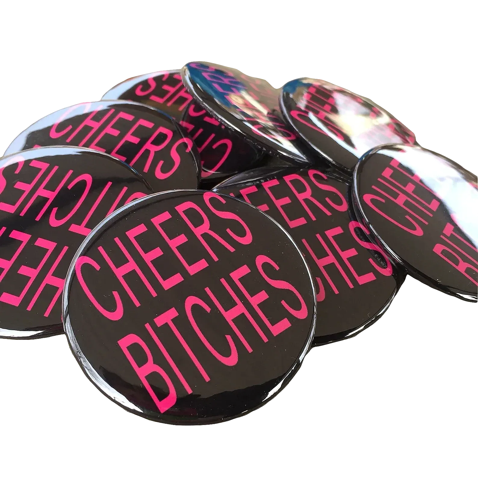Cheers B1tches, Bachelorette Pin 3 Inch - 1 is backordered and will ship as soon as it is back in stock.