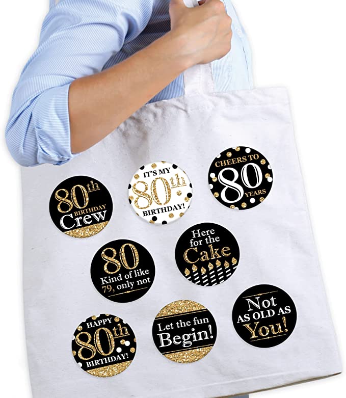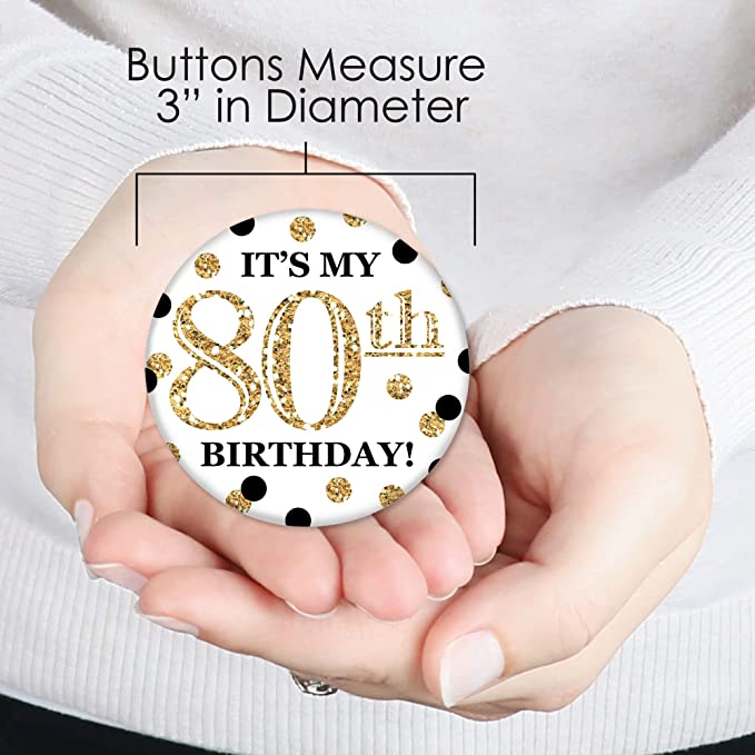 • MESSAGES MADE-EASY: Adult 80th Birthday - Gold Pinback Buttons are round-shaped, measuring 3 inches in diameter. Each set includes 8 gold birthday, easy-to-wear buttons; perfect for making a statement! Pass out to your group at birthday parties, and special gatherings, or hand out individually.