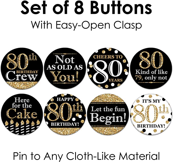 • Adult 80th Birthday - Gold Pinback Buttons INCLUDES 8 sturdy, round pinback buttons. Each set of 8 birthday buttons arrives assembled and ready for showing the world your special message.