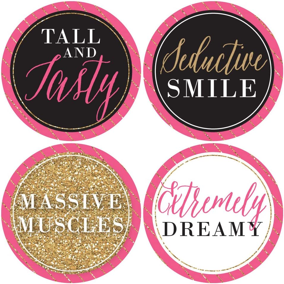 • Set of 12 Girls Night Out Bachelorette Man Hunt party badges each SIZE 4 inches diameter, a large size to perfectly highlight each party name. Party Badge Names: TALL AND TASTY, SEDUCTIVE SMILE, MASSIVE MUSCLES, EXTREMELY DREAMY, MISTER CUTIE, MR. RIGHT NOW, FUN & FLIRTY, HUNKY BARTENDER, GROOM LOOK-ALIKE, LADIES’ MAN, HUSBAND MATERIAL, MR. CONFIDENT.