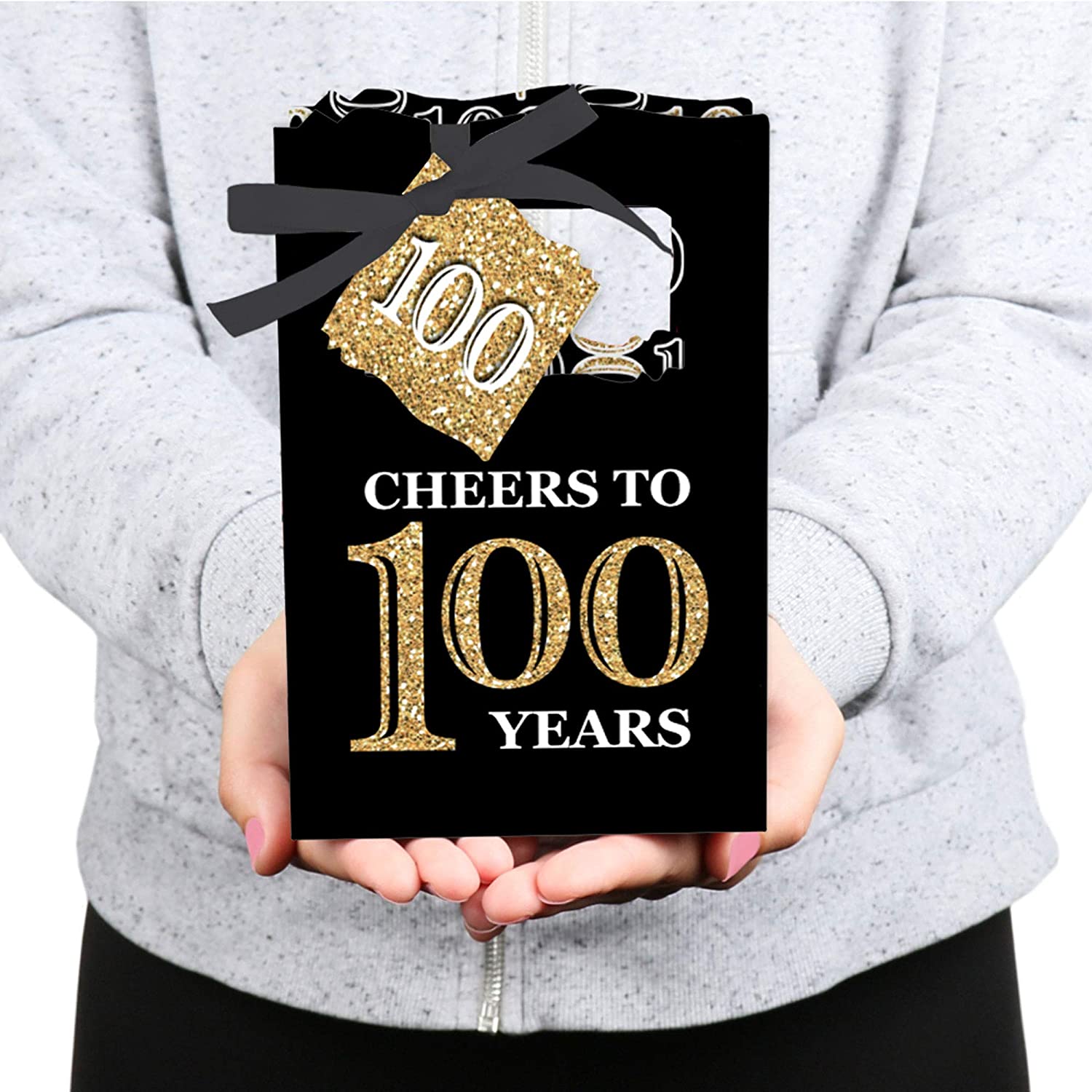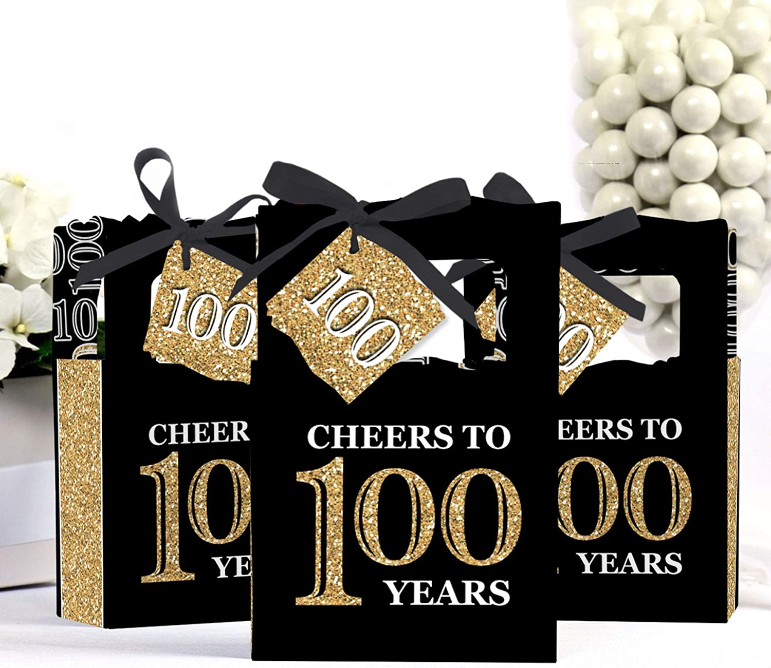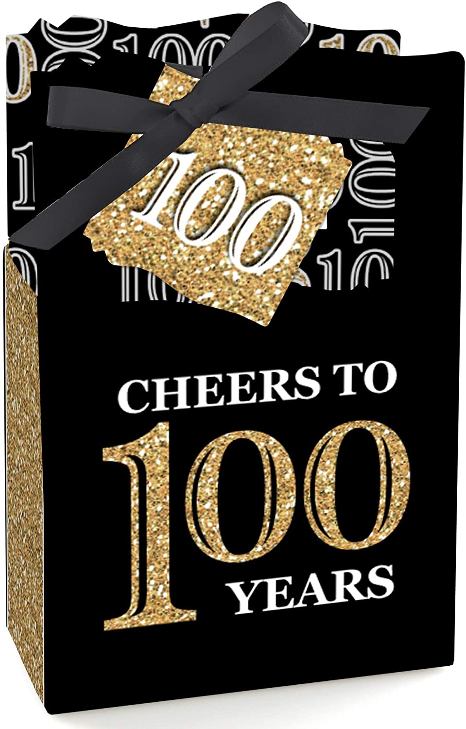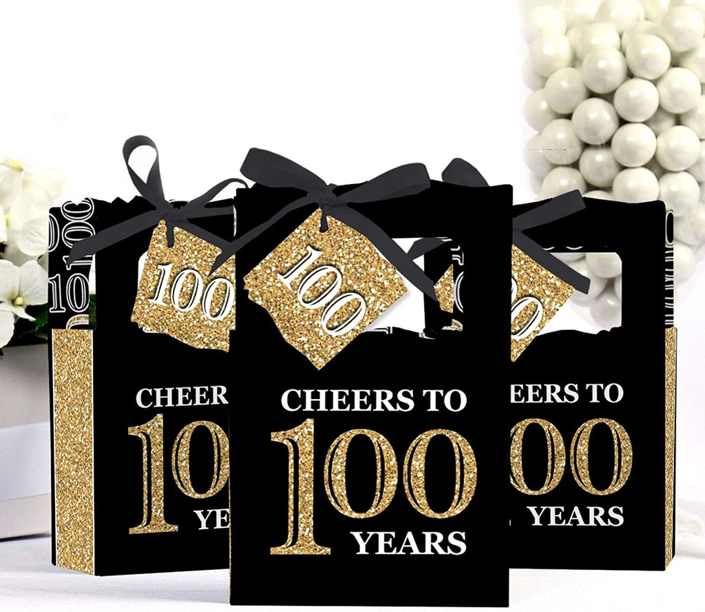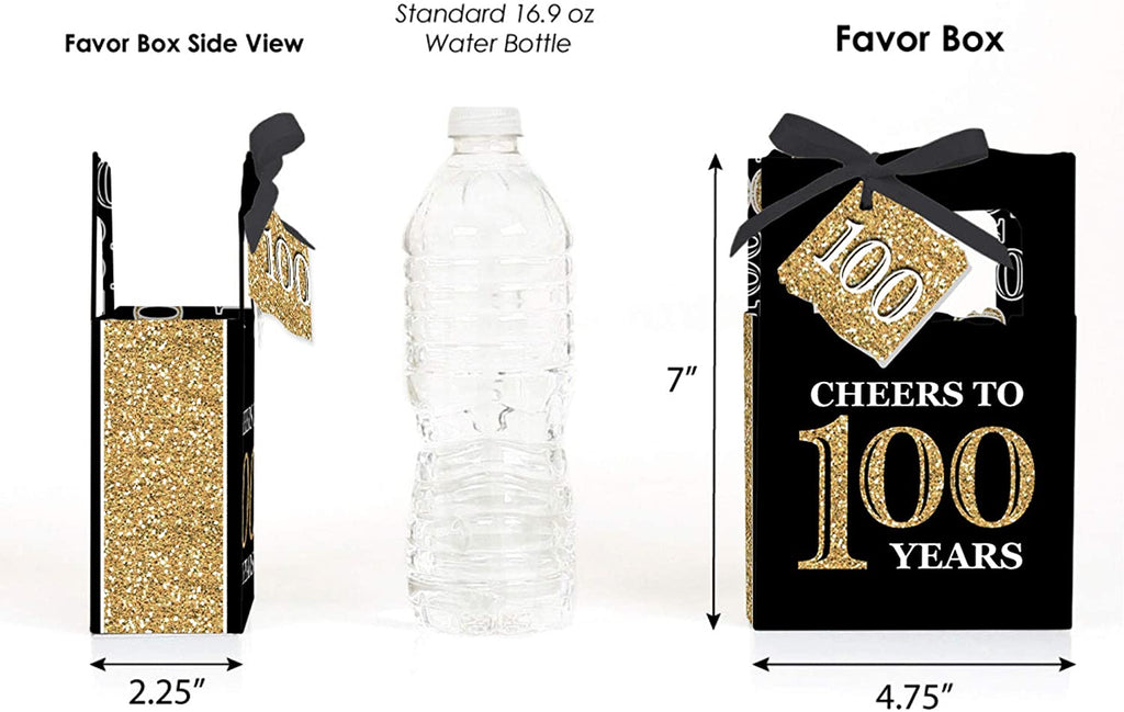 • PREMIUM PARTY FAVOR BOXES: Adult 100th Birthday - black and gold party favor boxes are professionally printed on heavy-duty cardstock paper with a photo-like shine. They are hand-folded and individually inspected, then carefully packaged. Favor boxes will arrive flat, partially assembled. Finishing assembly is required but it is easy. Once assembled, add the black, white, and gold gift tag with the included ribbon for perfect party favors!