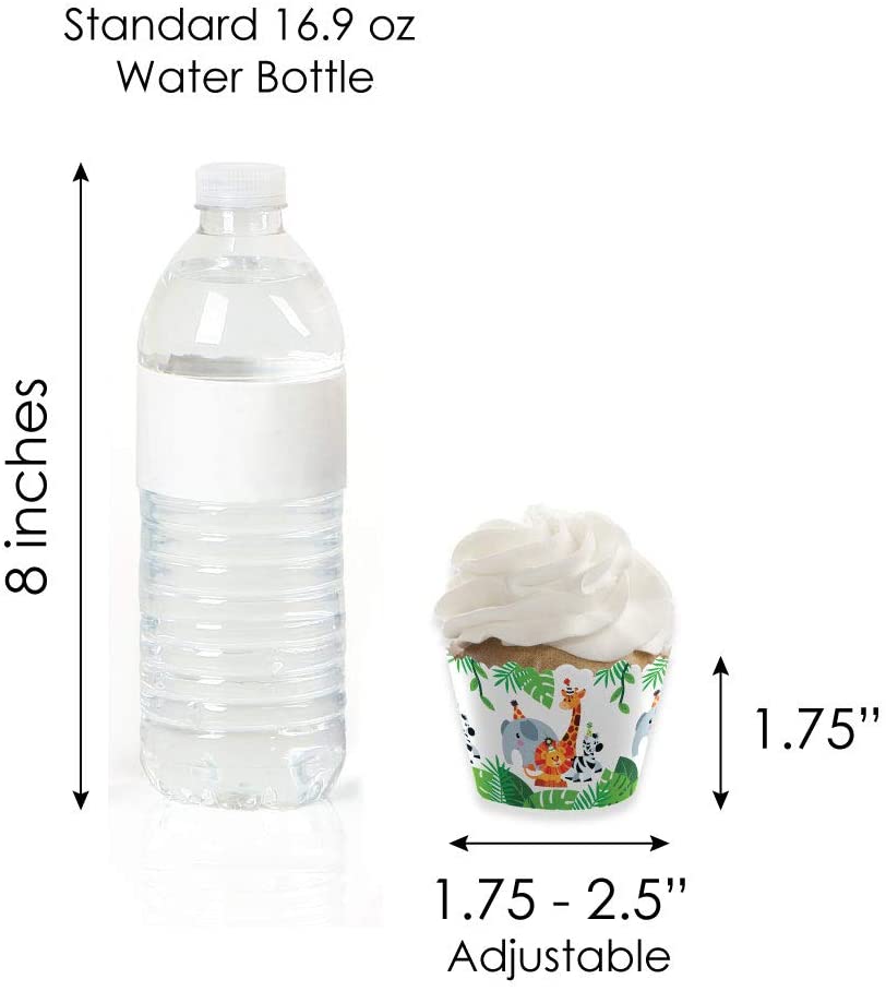 • Plastic clear treat picks SIZE measure 3.5” tall and are packaged in a food-safe environment. Jungle Party Animals shaped paper cut-outs vary in size and coordinate well with pick size. Cupcake wrappers are cut with a decorative edge and adjust to fit cupcakes 1.75” - 2.5” Wide. Wrappers measure 1.75” Tall. Wrappers are meant for one-time-use only and should not be baked.