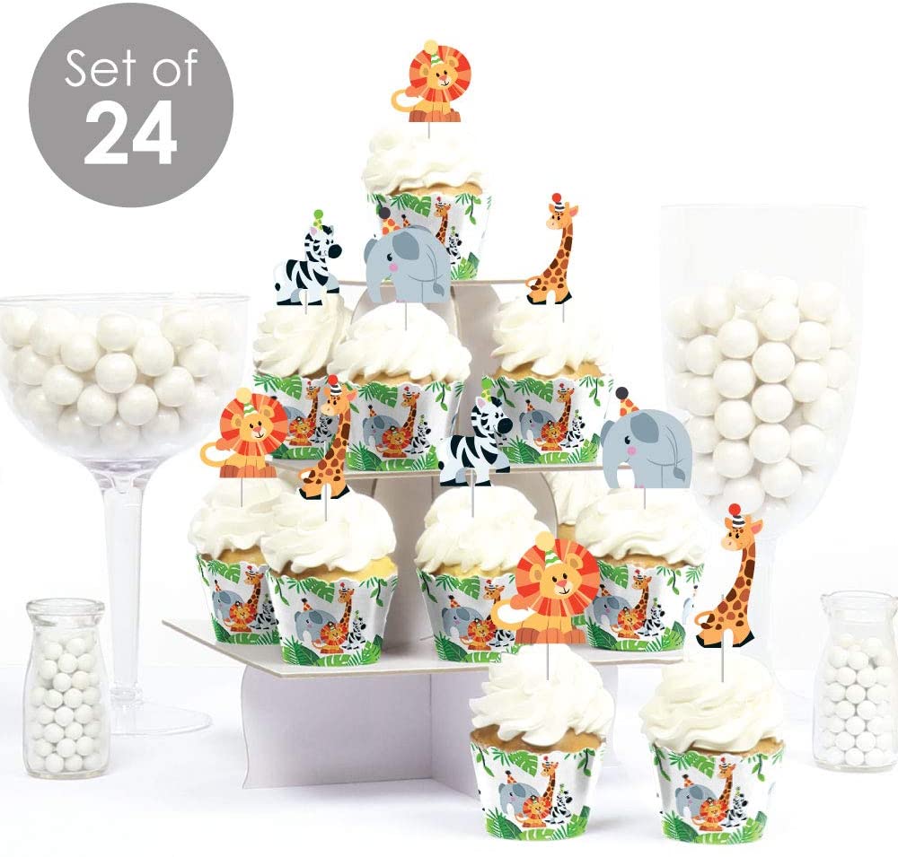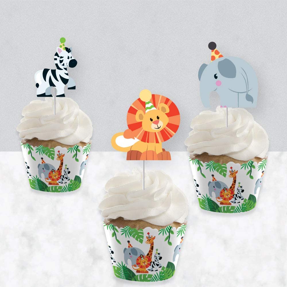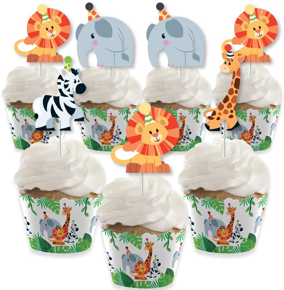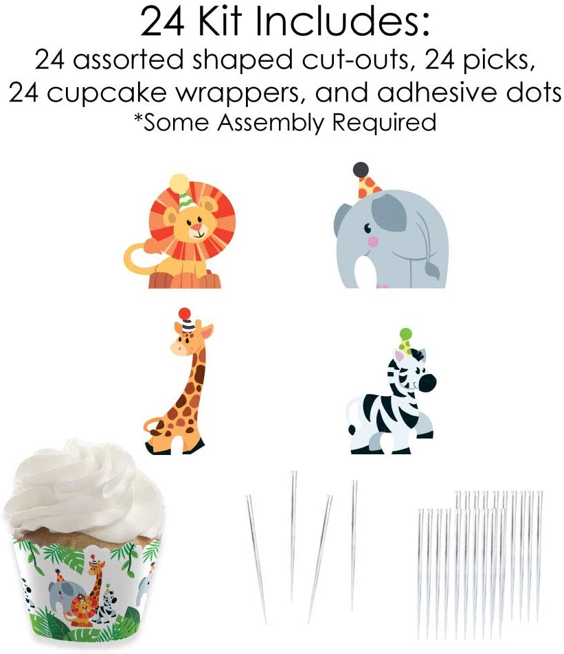 • Jungle Party Animals Cupcake Wrappers and Treat Picks Kit INCLUDES 24 assorted shaped paper cut-outs, 24 clear treat picks, 24 cupcake wrappers, and adhesive dots for easy assembly. DIY Jungle Party Animals cupcake decoration kit is perfect for any baby shower, birthday party.