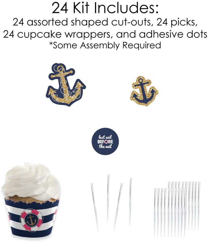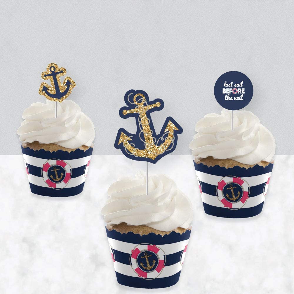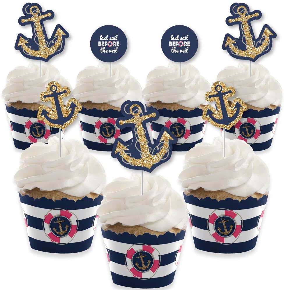Last Sail Before the Veil - Cupcake Decoration - Nautical Bachelorette and Bridal Shower Cupcake Wrappers and Treat Picks Kit - Set of 24
