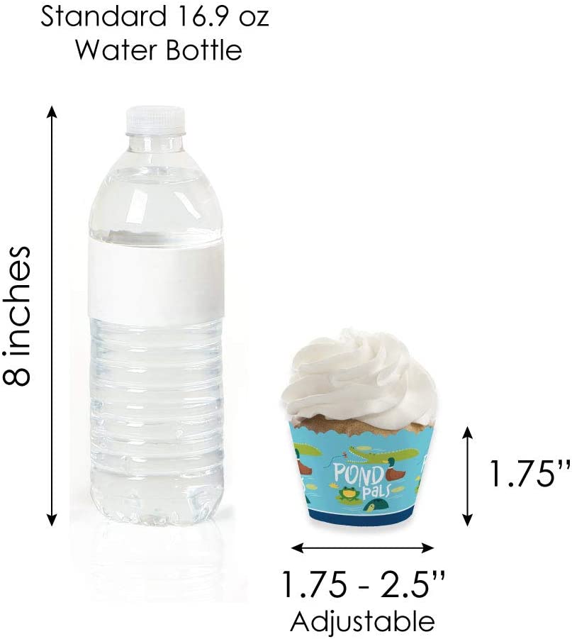 • Plastic clear treat picks SIZE measure 3.5” tall and are packaged in a food-safe environment. Pond Pals shaped paper cut-outs vary in size and coordinate well with pick size. Cupcake wrappers are cut with a decorative edge and adjust to fit cupcakes 1.75” - 2.5” Wide. Wrappers measure 1.75” Tall. Wrappers are meant for one-time-use only and should not be baked.