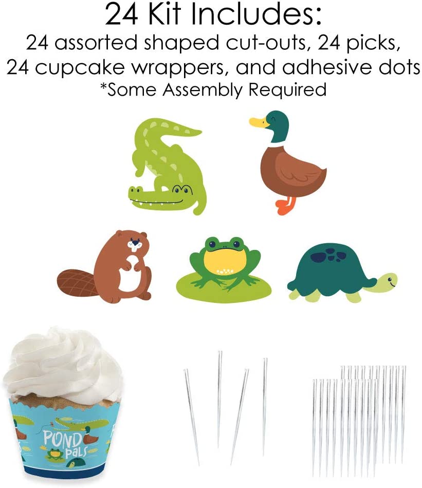 • Pond Pals Cupcake Wrappers and Treat Picks Kit INCLUDES 24 assorted shaped paper cut-outs, 24 clear treat picks, 24 cupcake wrappers, and adhesive dots for easy assembly. DIY Pond Pals cupcake decoration kit is perfect for any baby shower or birthday party.
