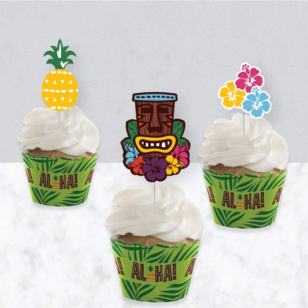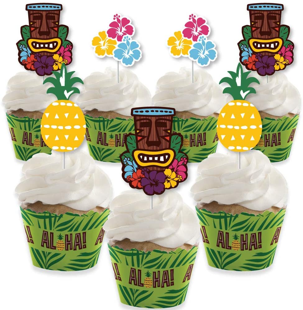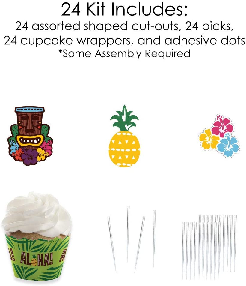 • Tiki Luau Cupcake Wrappers and Treat Picks Kit INCLUDES 24 assorted shaped paper cut-outs, 24 clear treat picks, 24 cupcake wrappers, and adhesive dots for easy assembly. DIY Tiki Luau cupcake decoration kit is perfect for any tropical Hawaiian summer party.
