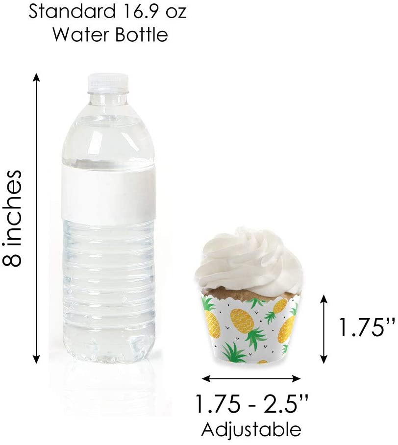 • Plastic clear treat picks SIZE measure 3.5” tall and are packaged in a food-safe environment. Tropical Pineapple shaped paper cut-outs vary in size and coordinate well with pick size. Cupcake wrappers are cut with a decorative edge and adjust to fit cupcakes 1.75” - 2.5” Wide. Wrappers measure 1.75” Tall. Wrappers are meant for one-time-use only and should not be baked.