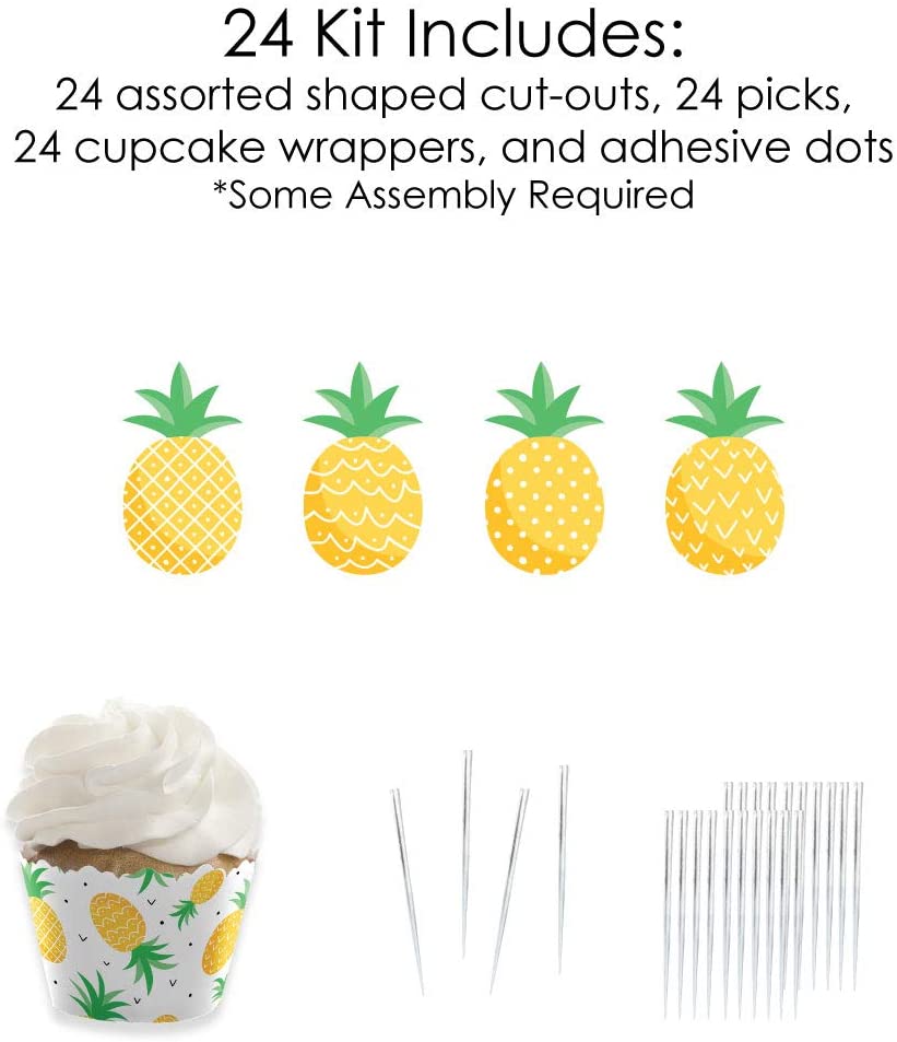 • Tropical Pineapple Cupcake Wrappers and Treat Picks Kit INCLUDES 24 assorted shaped paper cut-outs, 24 clear treat picks, 24 cupcake wrappers, and adhesive dots for easy assembly. DIY Tropical Pineapple cupcake decoration kit is perfect for any summer party.