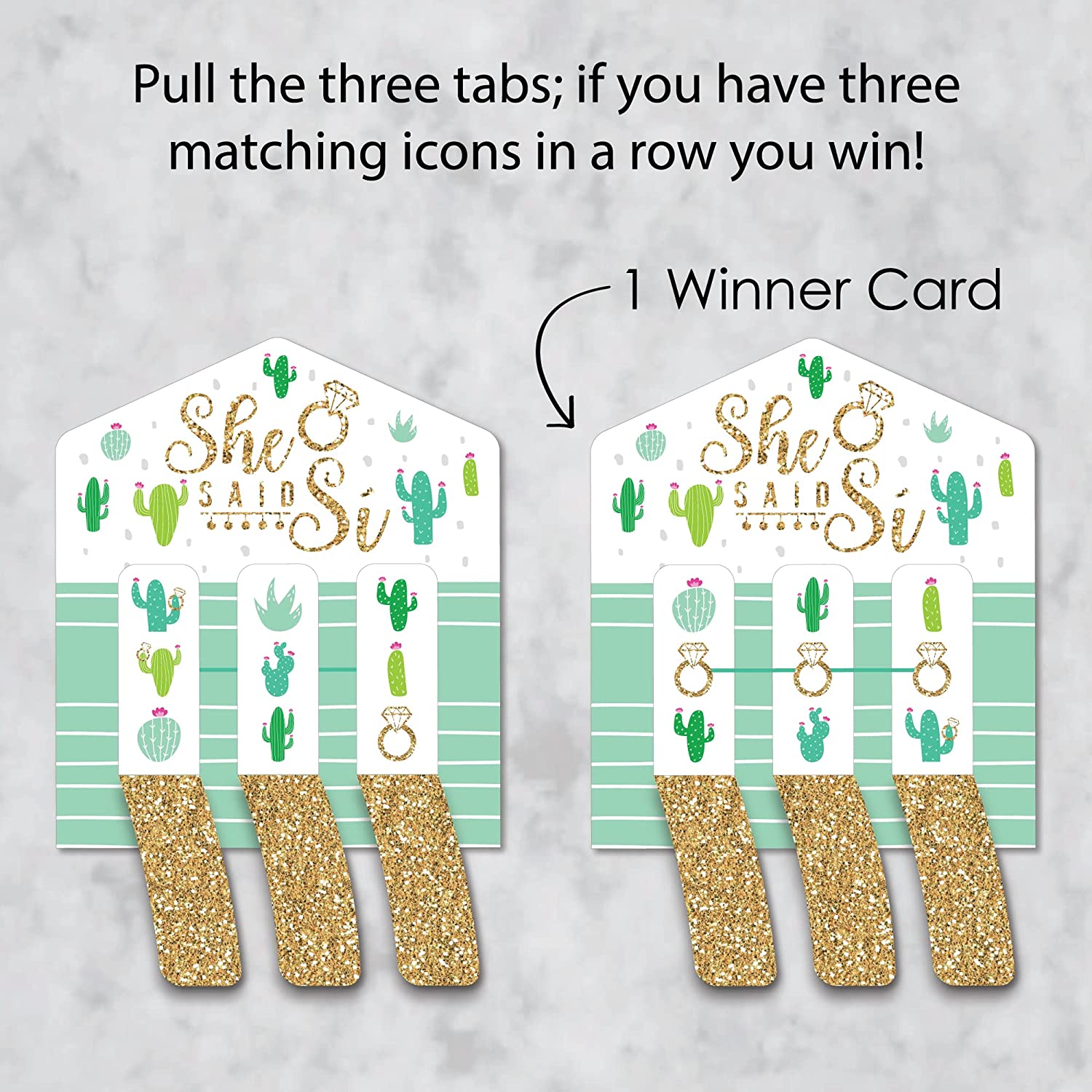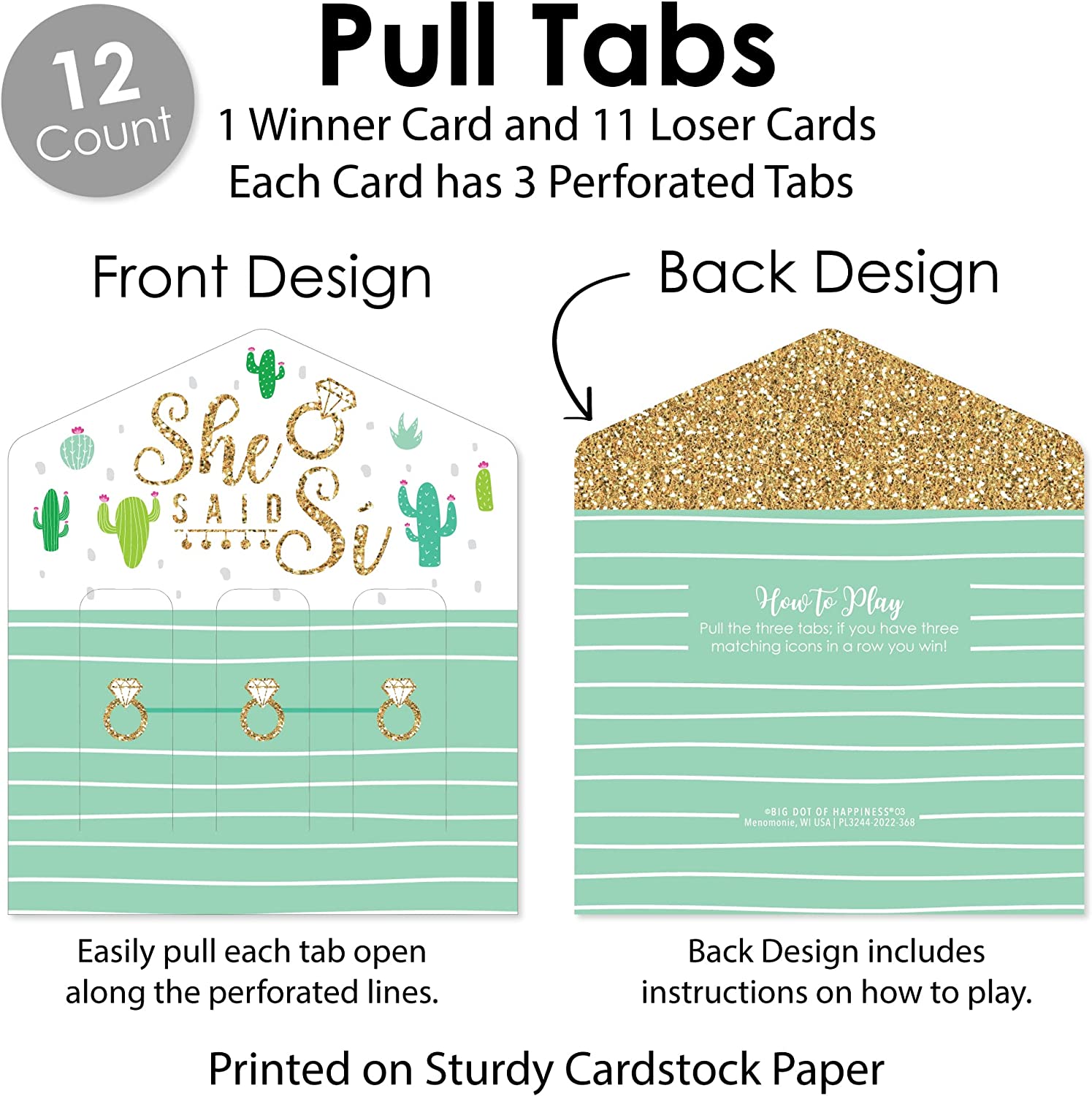 • Final Fiesta Pull Tabs 3-in-a-Row INCLUDES 12 pull tab game cards with 1 winning card and 11 losing cards. Great for a last fiesta bachelorette party, these game cards are for entertainment purposes only.