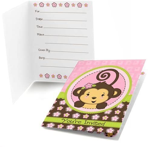 Pink Monkey Girl - Fill-In Baby Shower or Birthday Party Invitations (8 count)