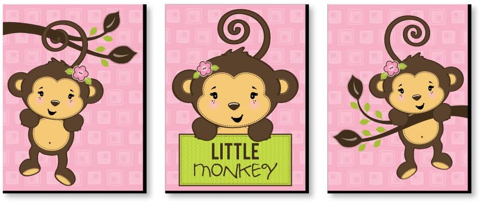 Pink Monkey Girl - Baby Girl Nursery Wall Art and Kids Room Decorations - Gift Ideas - 7.5 x 10 inches - Set of 3 Prints