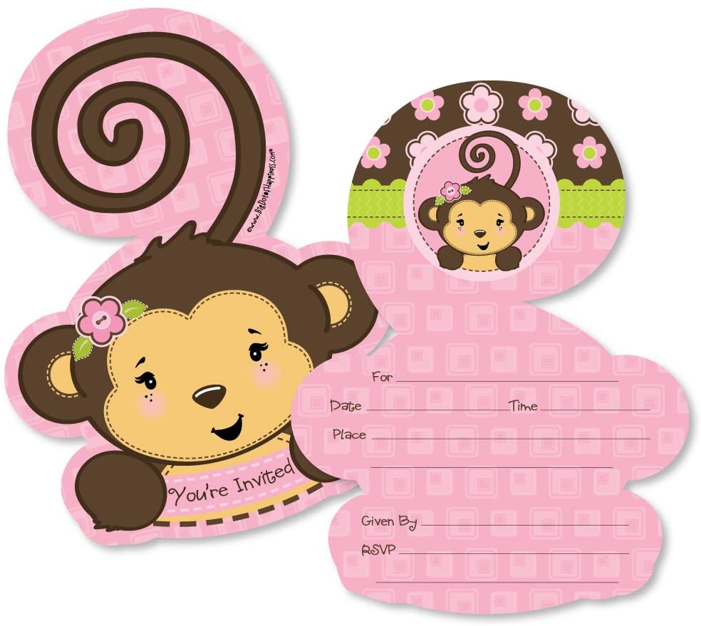 Pink Monkey Girl - Shaped Fill-In Invitations - Baby Shower or Birthday Party Invitation Cards with Envelopes - Set of 12