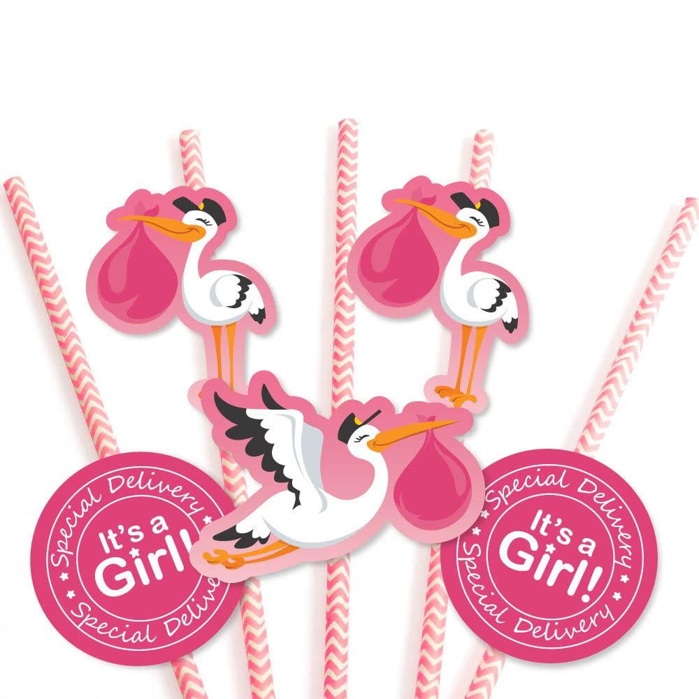 Girl Special Delivery - Paper Straw Decor - Pink It's A Girl Stork Baby Shower Striped Decorative Straws - Set of 24