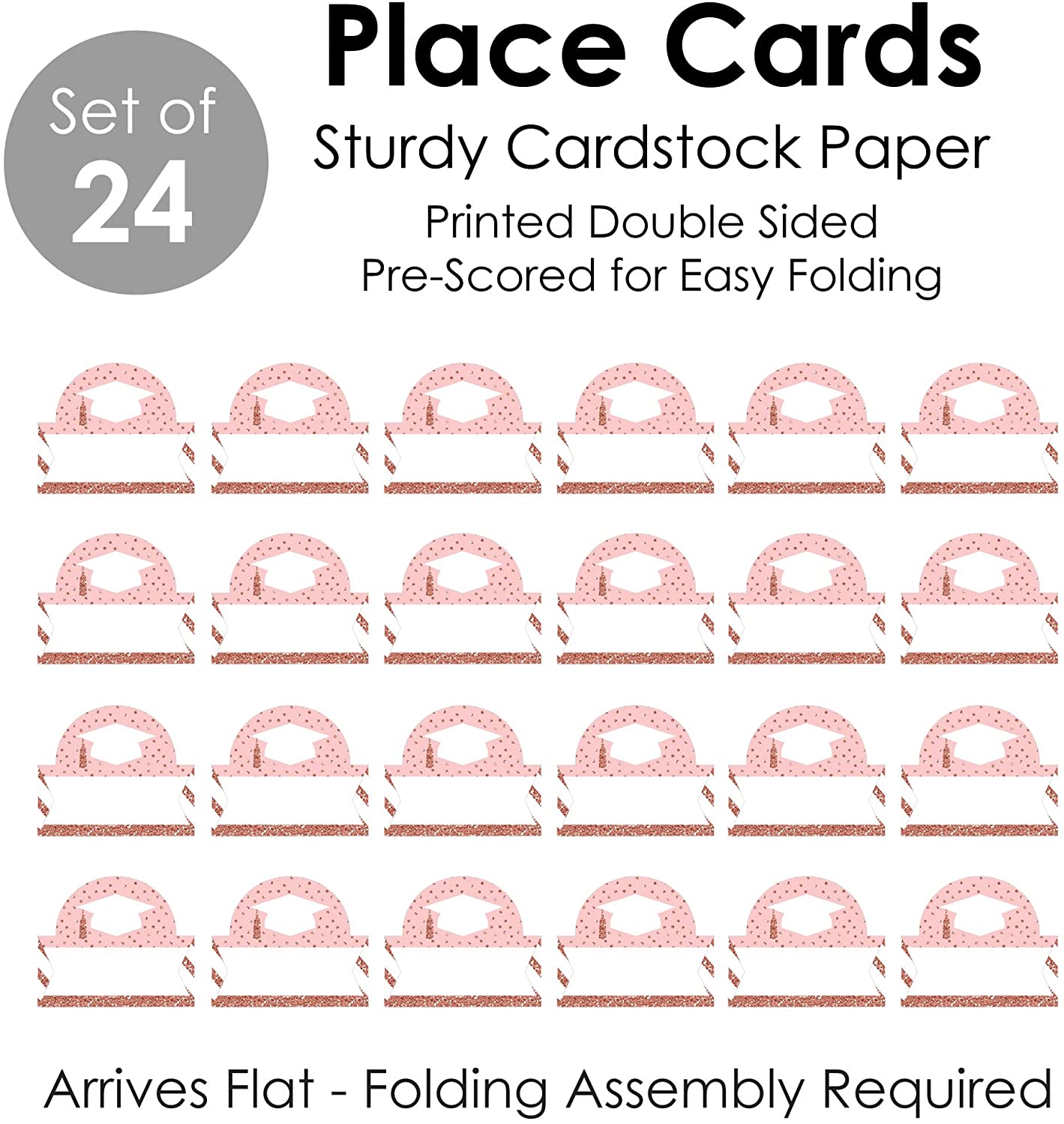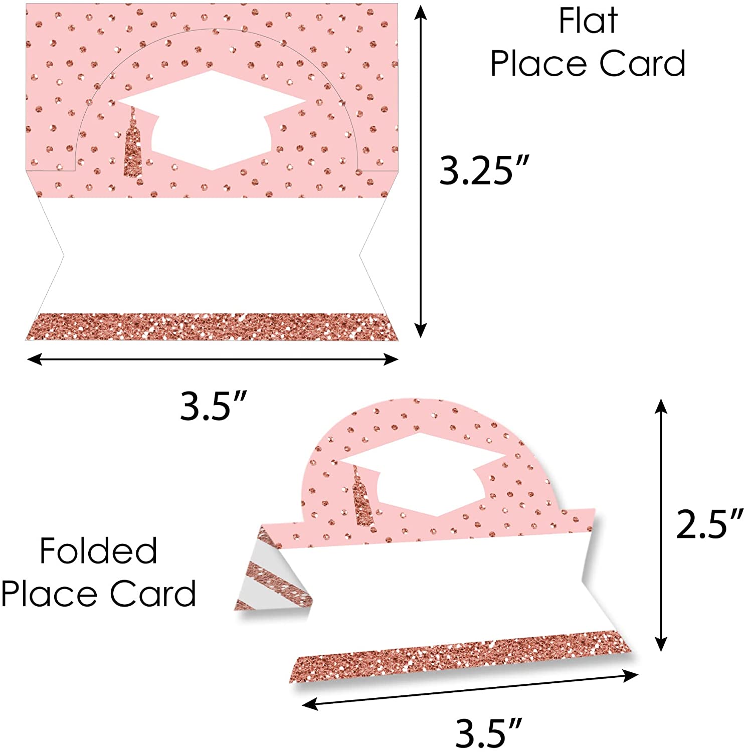 • Rose Gold Grad Place Cards INCLUDES 24 individual cards that measure 3.5” wide x 2.5” tall when assembled. Easy to use, these tabletop accents are perfect to use at your next Graduation party.
