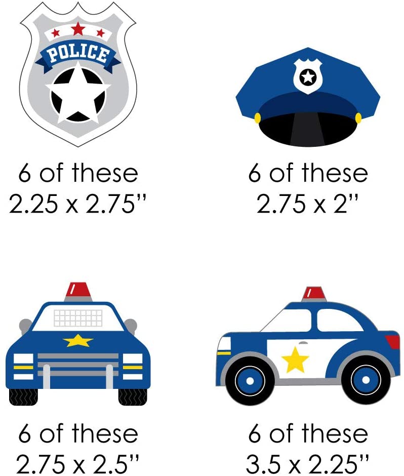 • Police Straw Decor party kit SIZE 6 badge paper die cuts (2.25” X 2.75”); 6 cop hat paper die cuts (2.75” x 2”); 6 front of cop car paper die cuts (2.75” x 2.5”); 6 cop car paper die cuts (3.5” x 2.25”) and 25 chevron striped paper straws 7.75" tall.