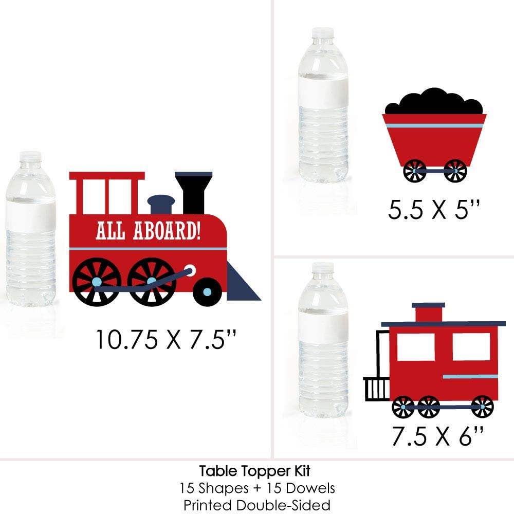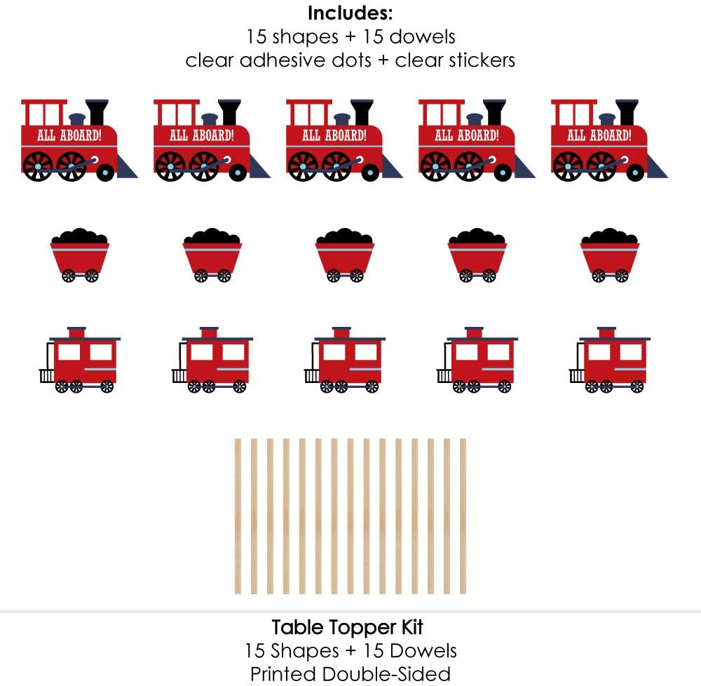 • Railroad Party Crossing Party Centerpiece Sticks SIZE five Steam train table toppers, 10.75” wide x 7.5” tall; five Coal car table toppers, 5.5” wide x 5” tall; and five Caboose table toppers, 7.5” wide x 6” tall. The unique design and variety of pieces makes this table decoration kit an impressive addition to any train theme party.