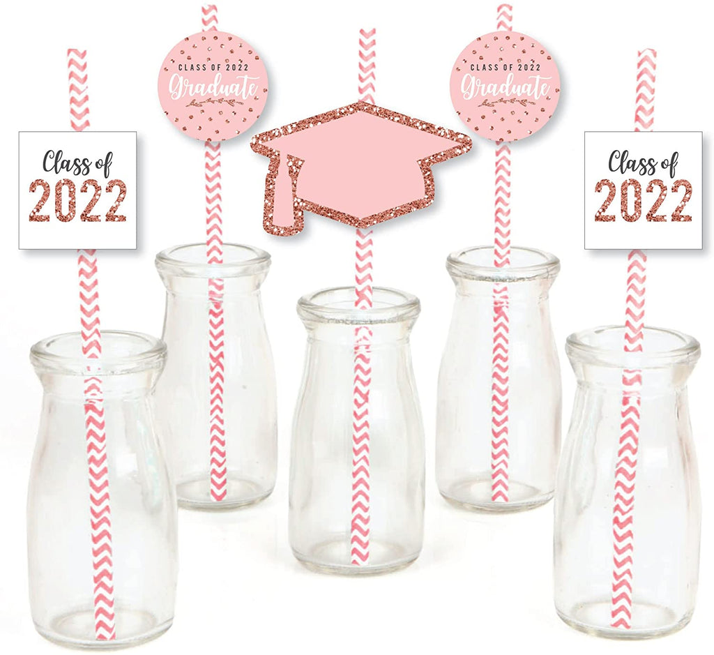 Rose Gold Grad - Paper Straw Decor - 2022 Graduation Party Striped Decorative Straws - Set of 24