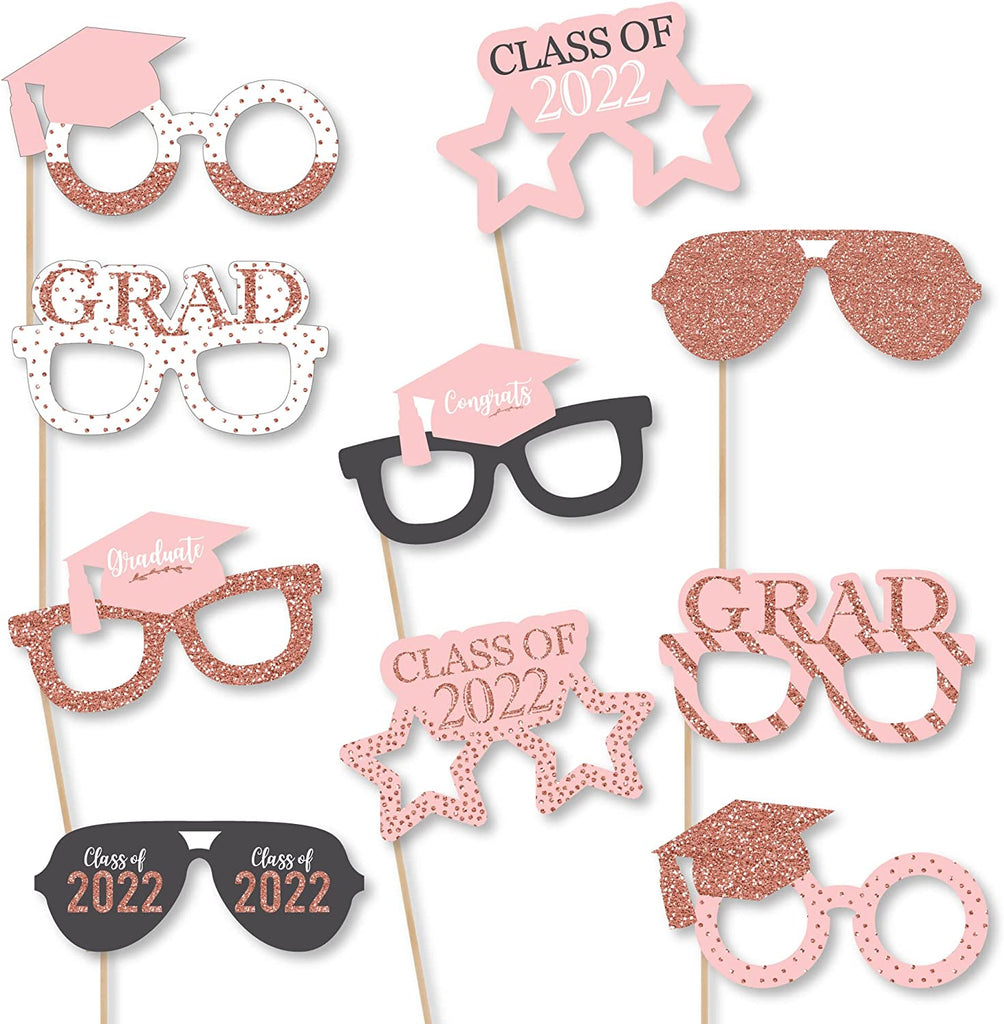 Rose Gold Grad Glasses - 2022 Paper Card Stock Graduation Party Photo Booth Props Kit - 10 Count