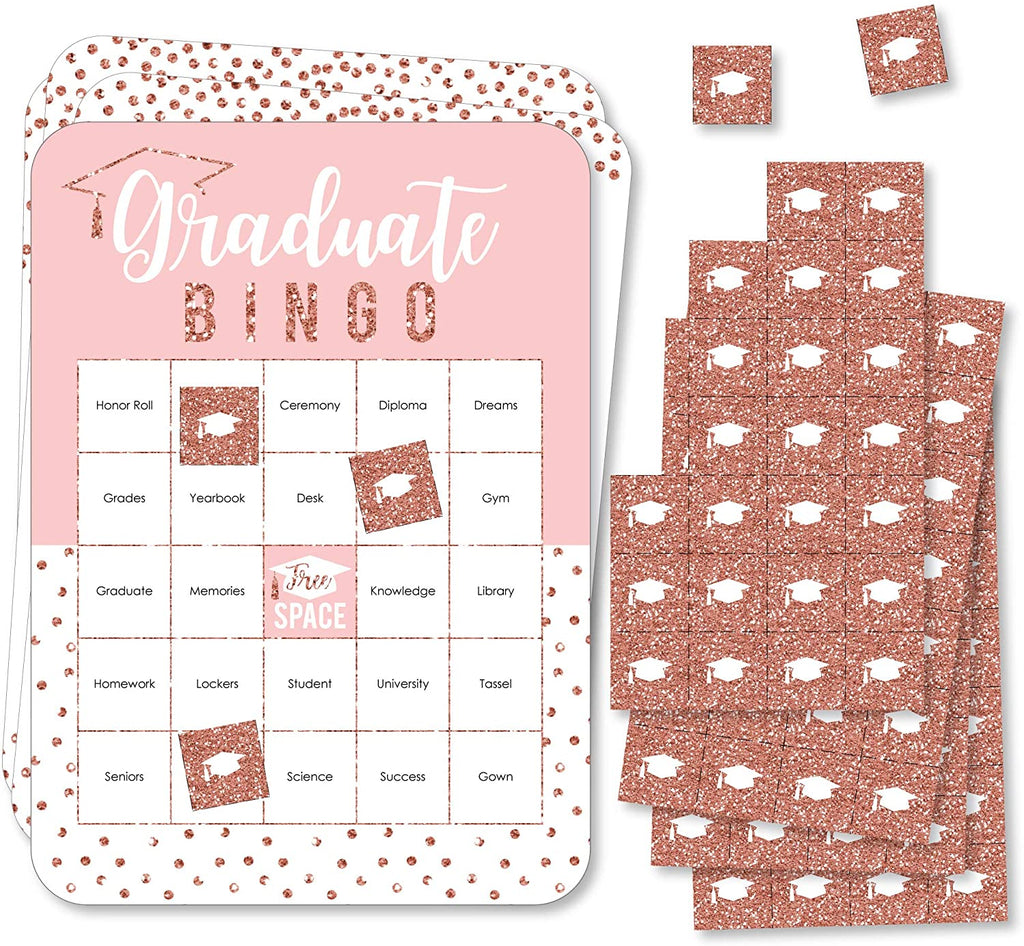 Rose Gold Grad - Bingo Cards and Markers - Graduation Party Shaped Bingo Game - Set of 18