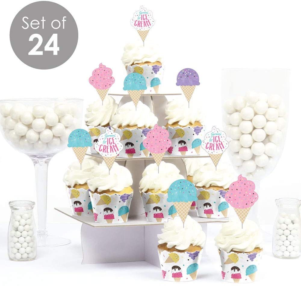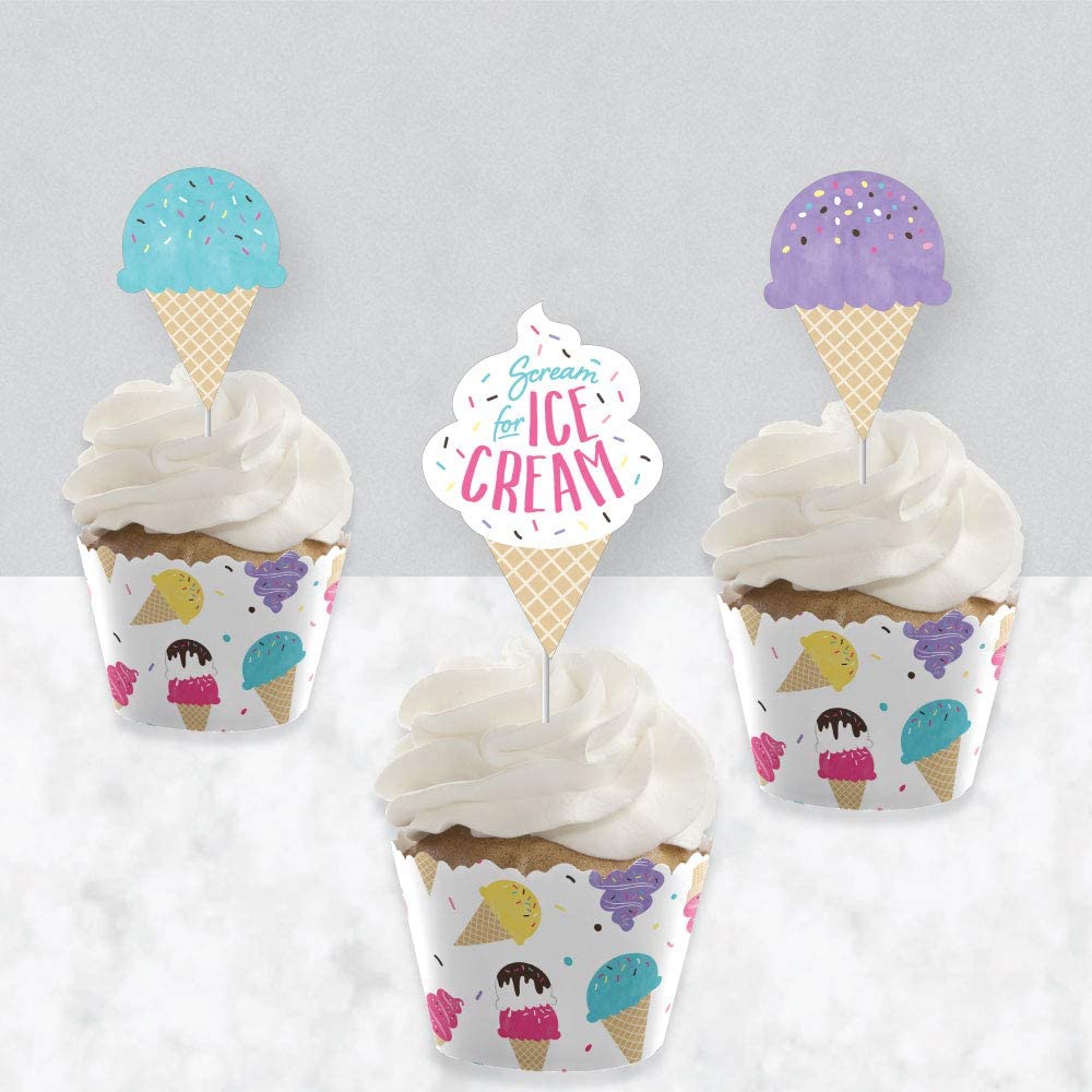 Scoop Up the Fun - Ice Cream - Cupcake Decoration - Sprinkles Party Cupcake Wrappers and Treat Picks Kit - Set of 24