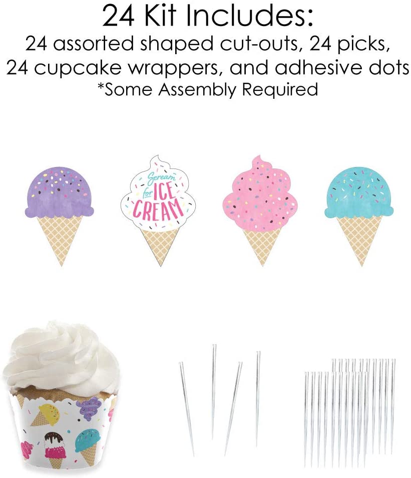 • Scoop Up The Fun - Ice Cream Cupcake Wrappers and Treat Picks Kit INCLUDES 24 assorted shaped paper cut-outs, 24 clear treat picks, 24 cupcake wrappers, and adhesive dots for easy assembly. DIY Scoop Up The Fun - Ice Cream cupcake decoration kit is perfect for any sprinkles party.