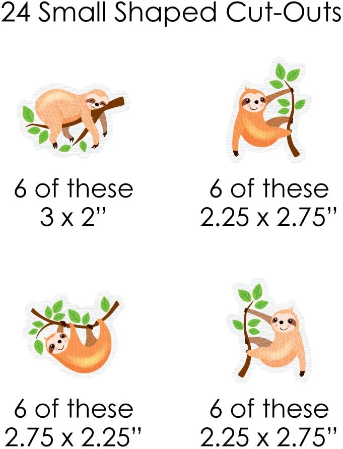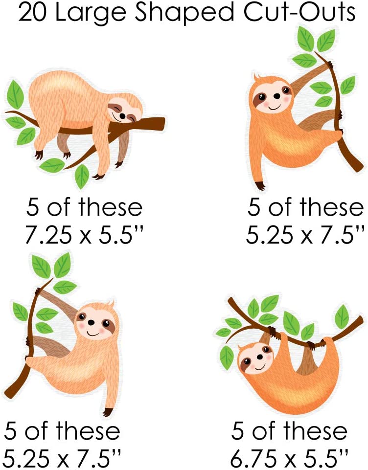 • DIY PARTY SUPPLIES: Let’s Hang - Sloth small paper shaped cut-out SIZE 6 Sloth (3” x 2”), 6 Sloth (2.25” x 2.75”), 6 Sloth (2.75” x 2.25”), 6 Sloth (2.25” x 2.75”). Let’s Hang - Sloth large paper shaped cut-outs SIZE 5 Sloth (7.25” x 5.5”), 5 Sloth (5.25” x 7.5”), 5 Sloth (5.25” x 7.5”), 5 Sloth (6.75” x 5.5”).