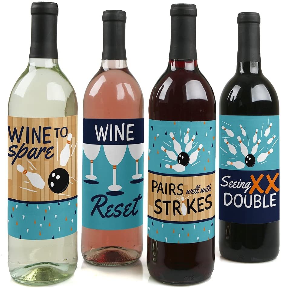 Strike Up the Fun - Bowling Decorations for Women and Men - Bowling Ball Party Wine Bottle Label Stickers - Set of 4