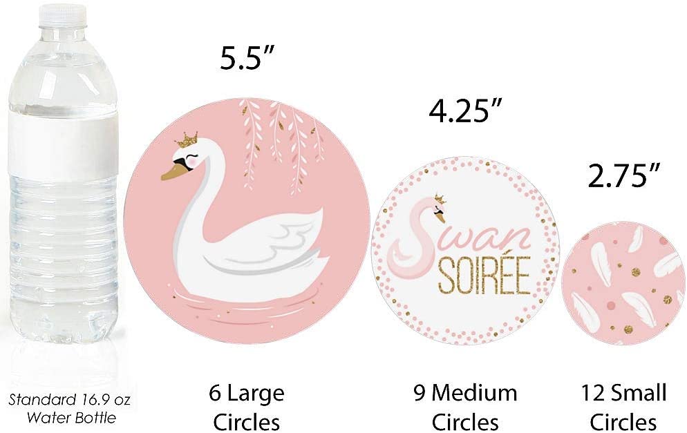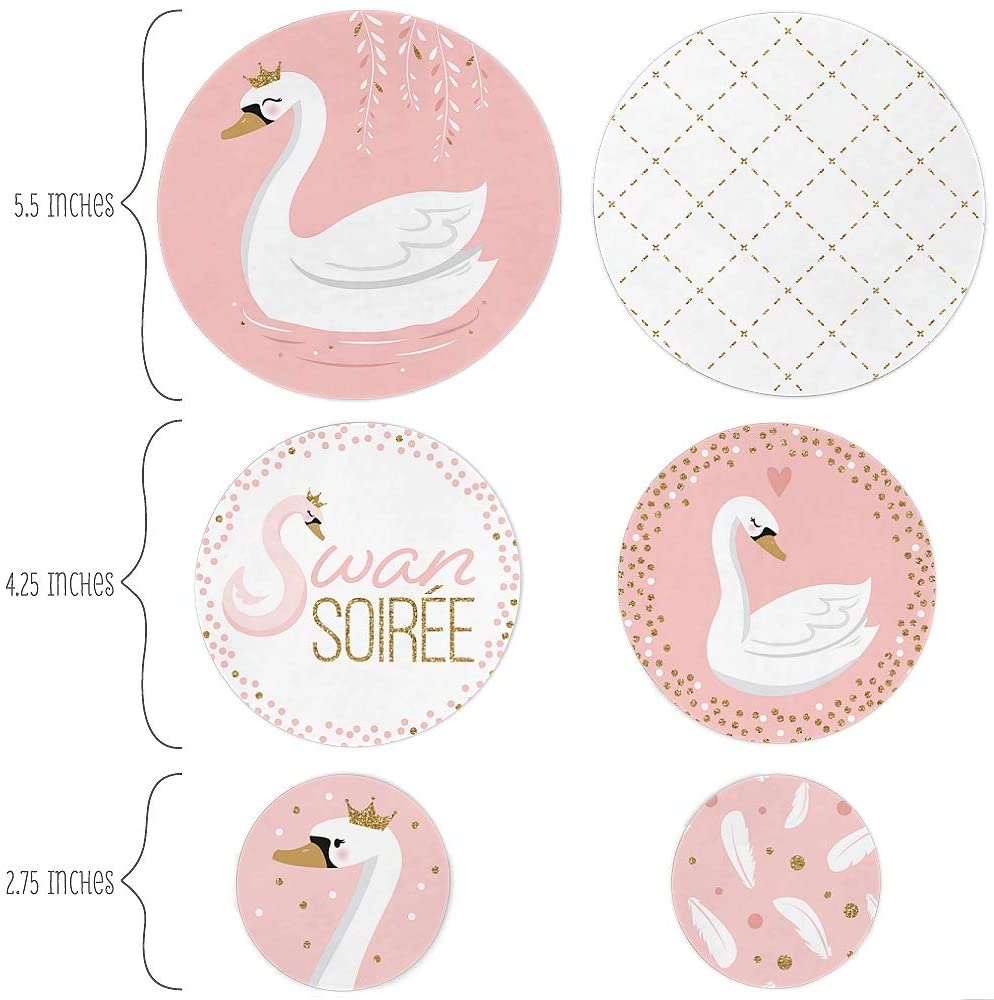 • Swan Soiree giant circle confetti SIZE 5.5 inches large circles, six qty; 4.25 inches medium circles, nine qty; and 2.75 inches small circles, twelve qty. The unique design and large size makes these swan princess party decorations an impressive addition to any baby shower or birthday party.