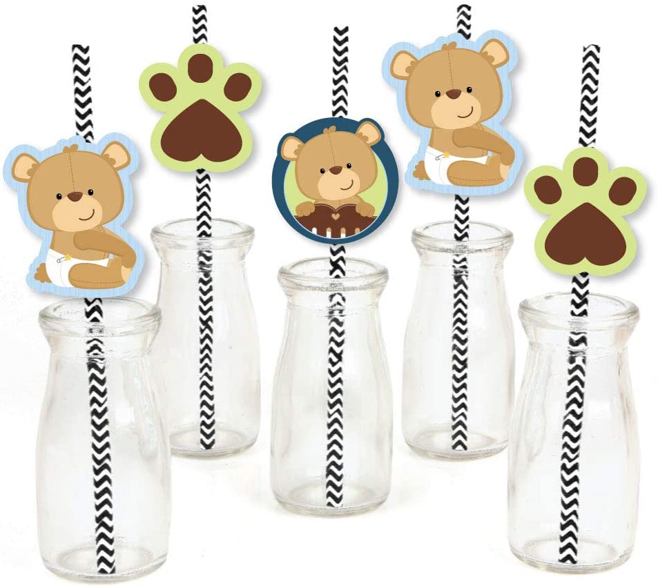 Baby Boy Teddy Bear Paper Straw Decor - Baby Shower Striped Decorative Straws - Set of 24