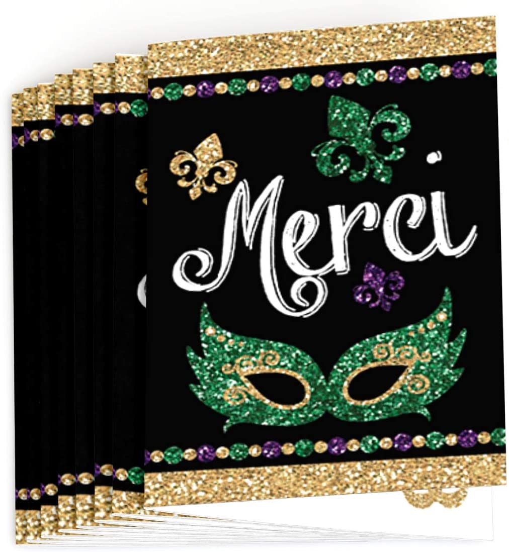• Masquerade Thank You Note Card Set INCLUDES 8 Mardi Gras party thank yous and premium white envelopes. Masquerade thank you notes are perfect for a Mardi Gras of any age.