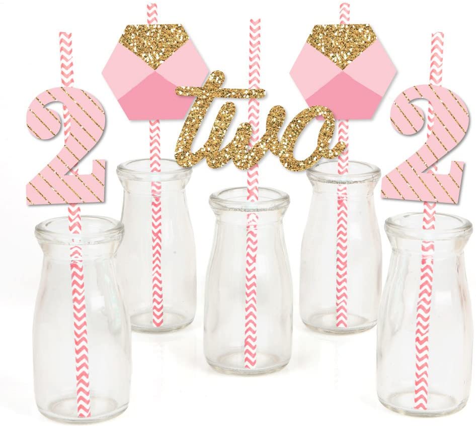 Two Much Fun Paper Straw Decor - Girl - 2nd Birthday Party Striped Decorative Straws - Set of 24
