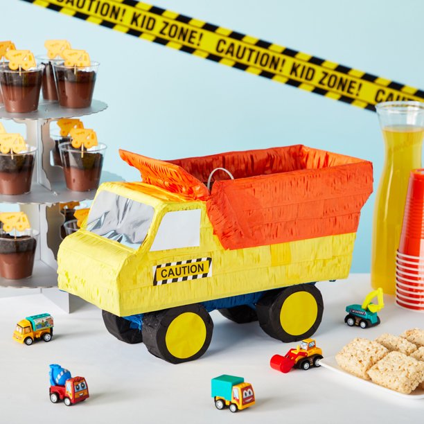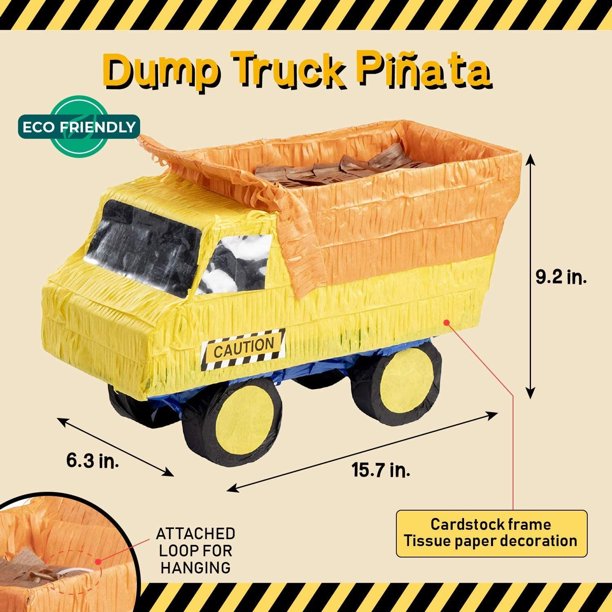 Your guests are sure to have a wide load of fun with this cute yellow construction dump truck pinata! Add this truck pinata to your construction party games to create a fun and enjoyable atmosphere for your transportation birthday party supplies, baby shower, or classroom celebration! Children and adults of all ages will enjoy taking their shot at this pinata, releasing the bulk favors, toys, or delicious chocolates hidden inside! Display the small pinata as a decorative table centerpiece or use the plastic loop at the top to hang from the roof, trees, railing, or ceiling. The pinata measures 15.7 x 9.2 x 6.3 inches with a small opening at the top for convenient filling.