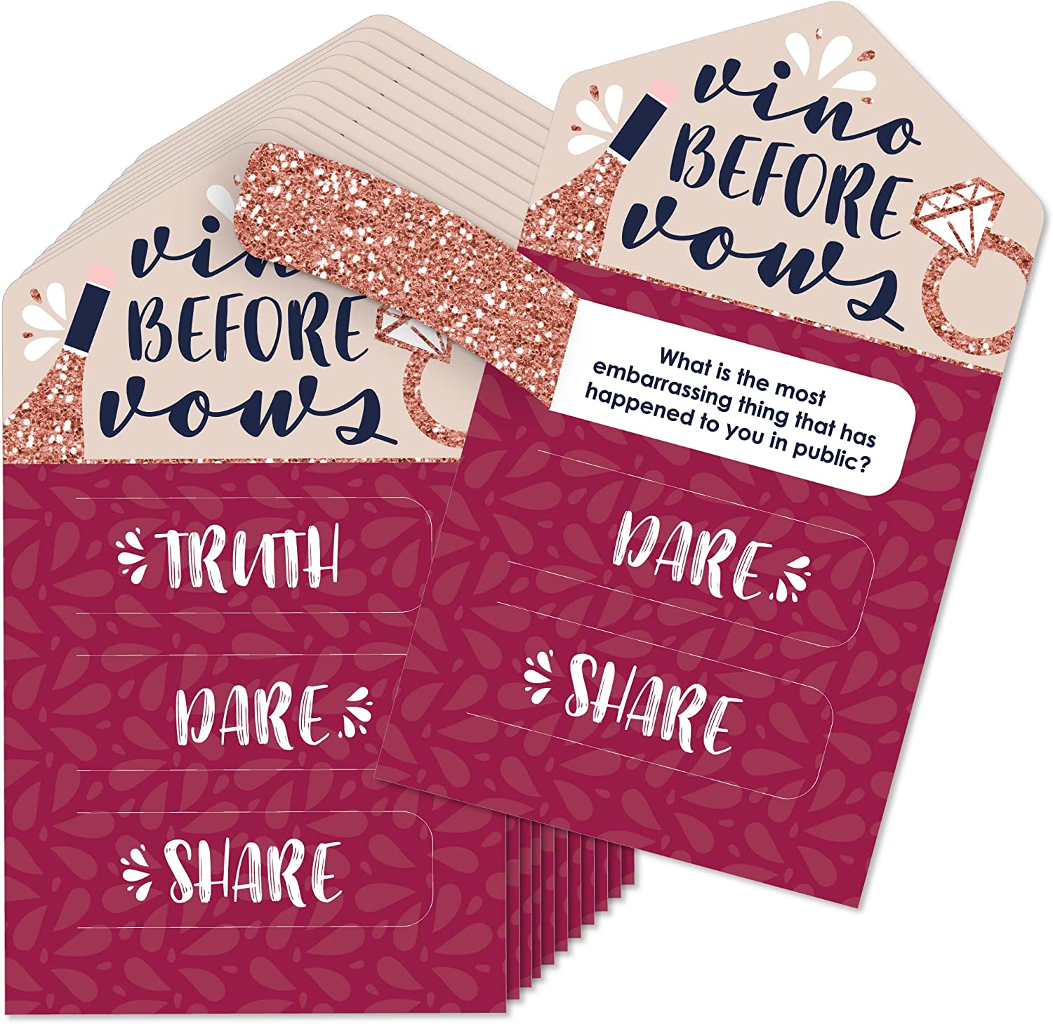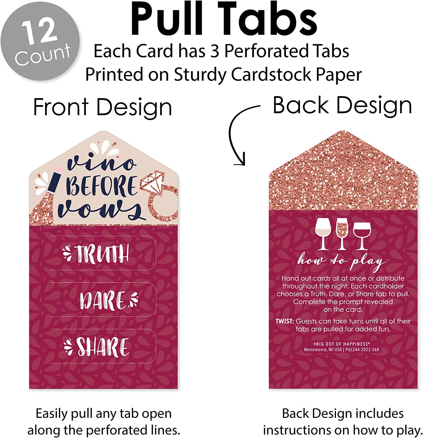 Vino Before Vows - Winery Bridal Shower or Bachelorette Party Custom Game Pickle Cards - Truth, Dare, Share Pull Tabs - Set of 12 is backordered and will ship as soon as it is back in stock.