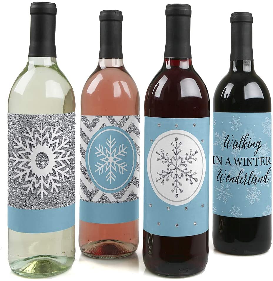Winter Wonderland - Snowflake Holiday Party and Winter Wedding Decorations for Women and Men - Wine Bottle Label Stickers - Set of 4