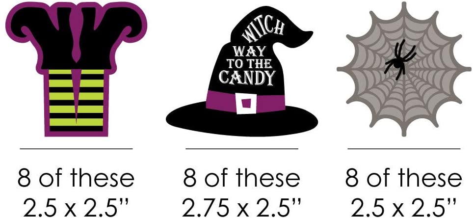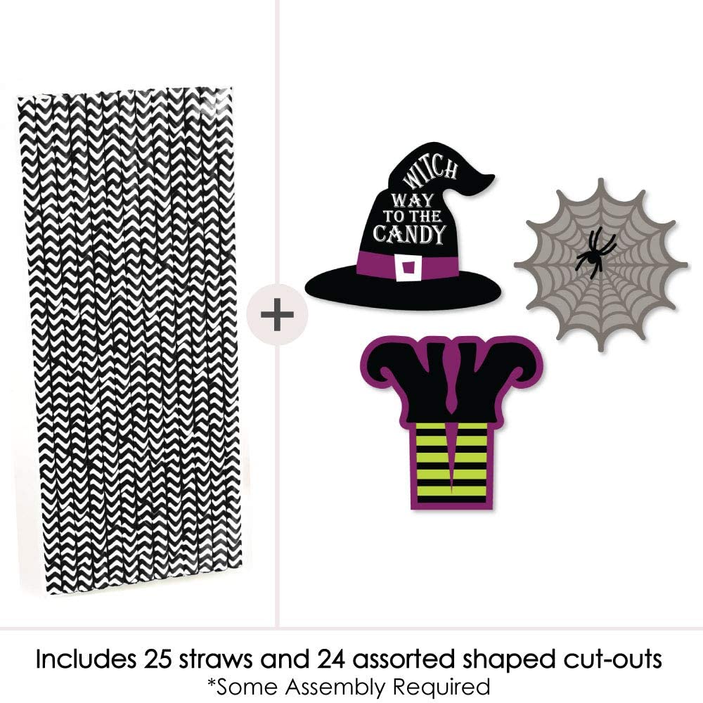 • Witch Straw Decor party kit SIZE 8 witch legs 2.5" wide x 2.5" tall; 8 witches hat 2.75" wide x 2.5" tall; 8 spider web 2.5” wide x 2.5” tall and 25 chevron striped paper straws 7.75" tall.