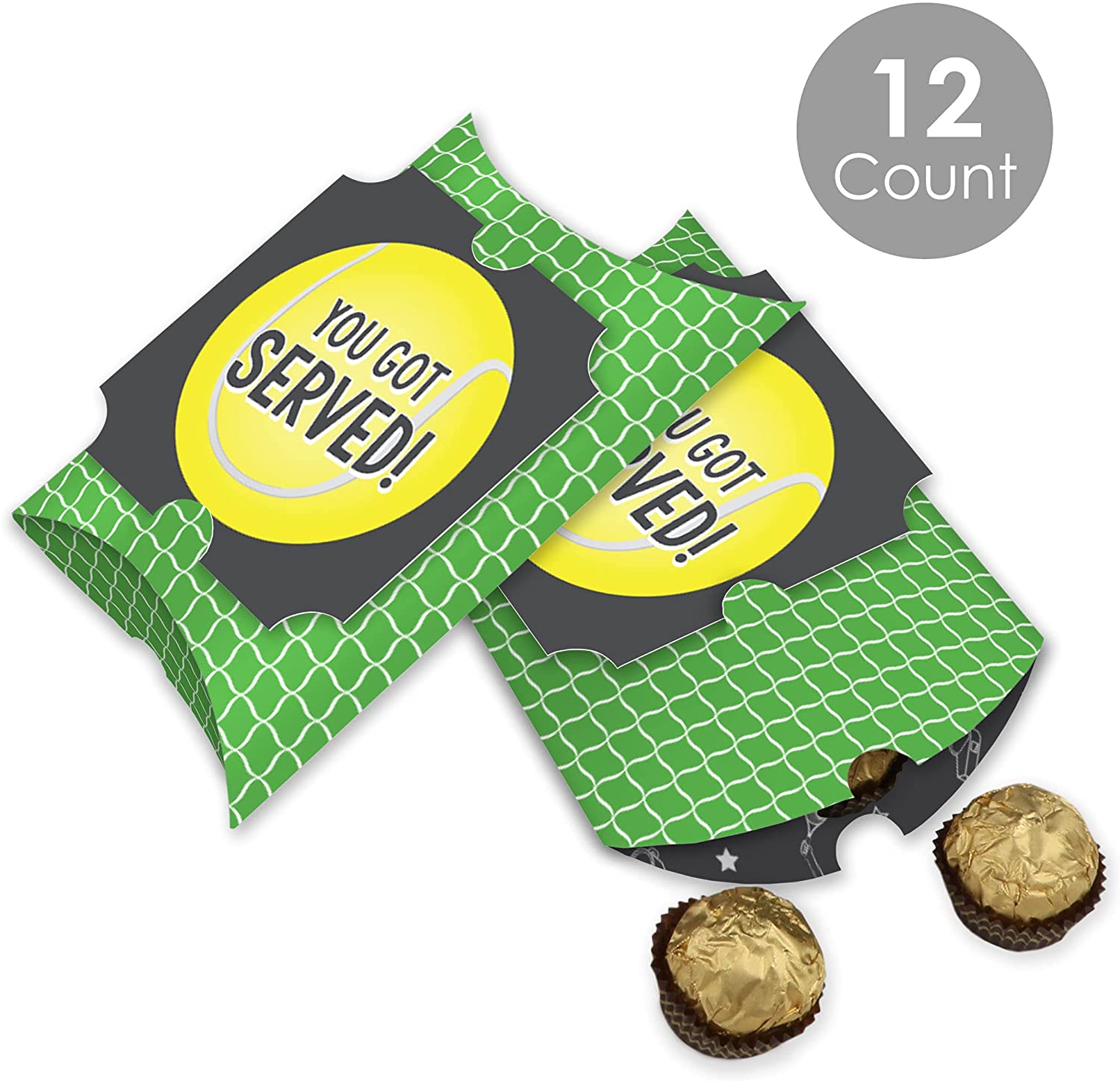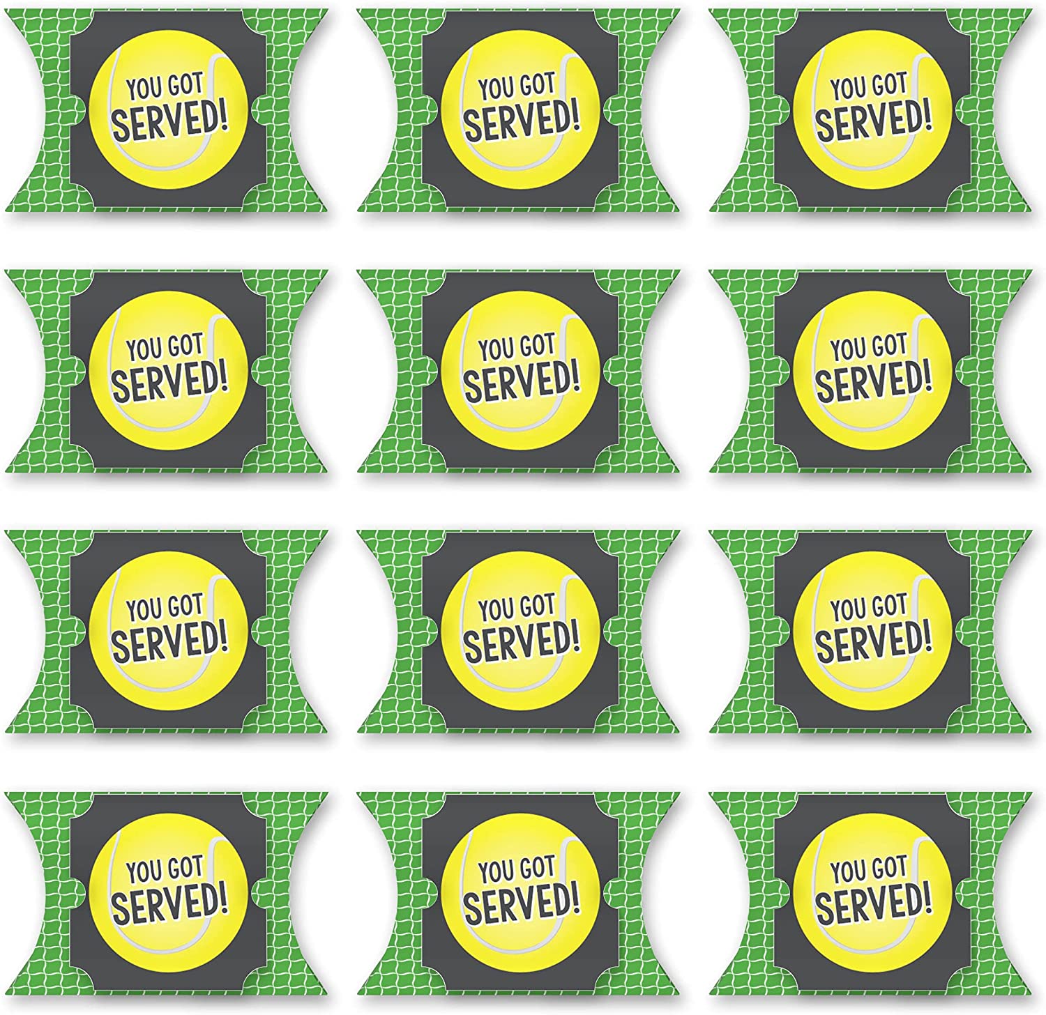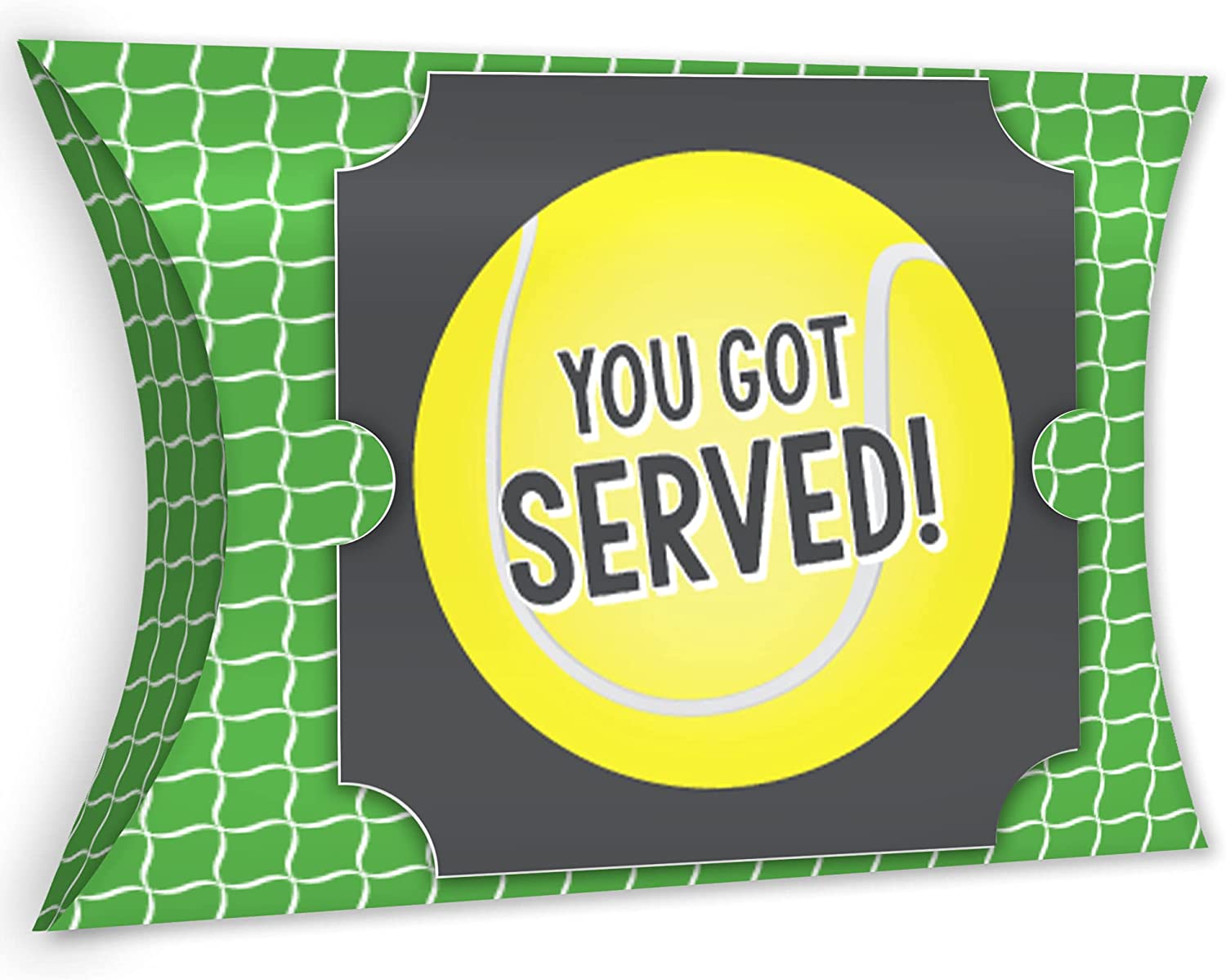 You Got Served - Tennis - Favor Gift Boxes - Baby Shower or Tennis Ball Birthday Party Large Pillow Boxes - Set of 12 is backordered and will ship as soon as it is back in stock.