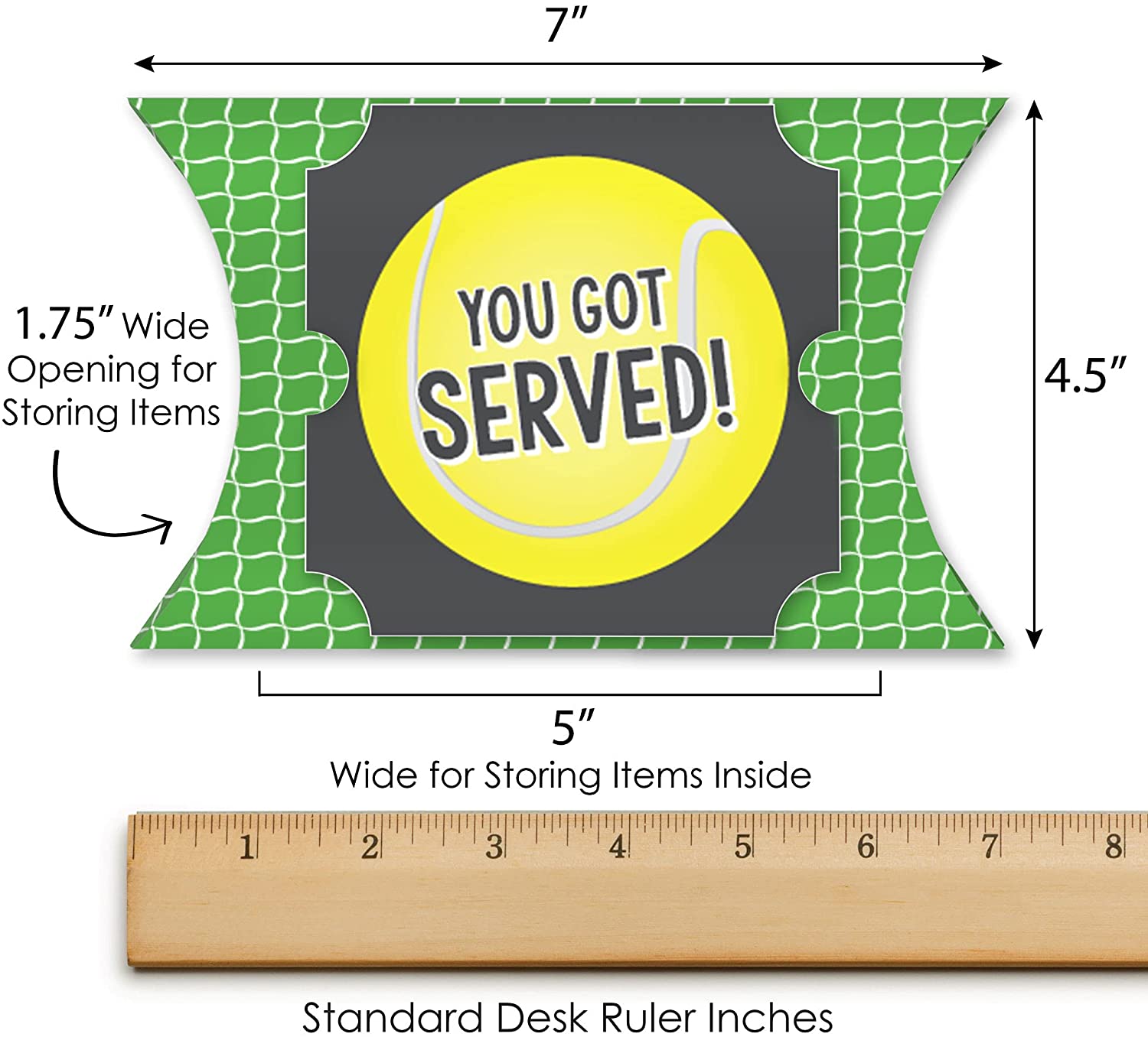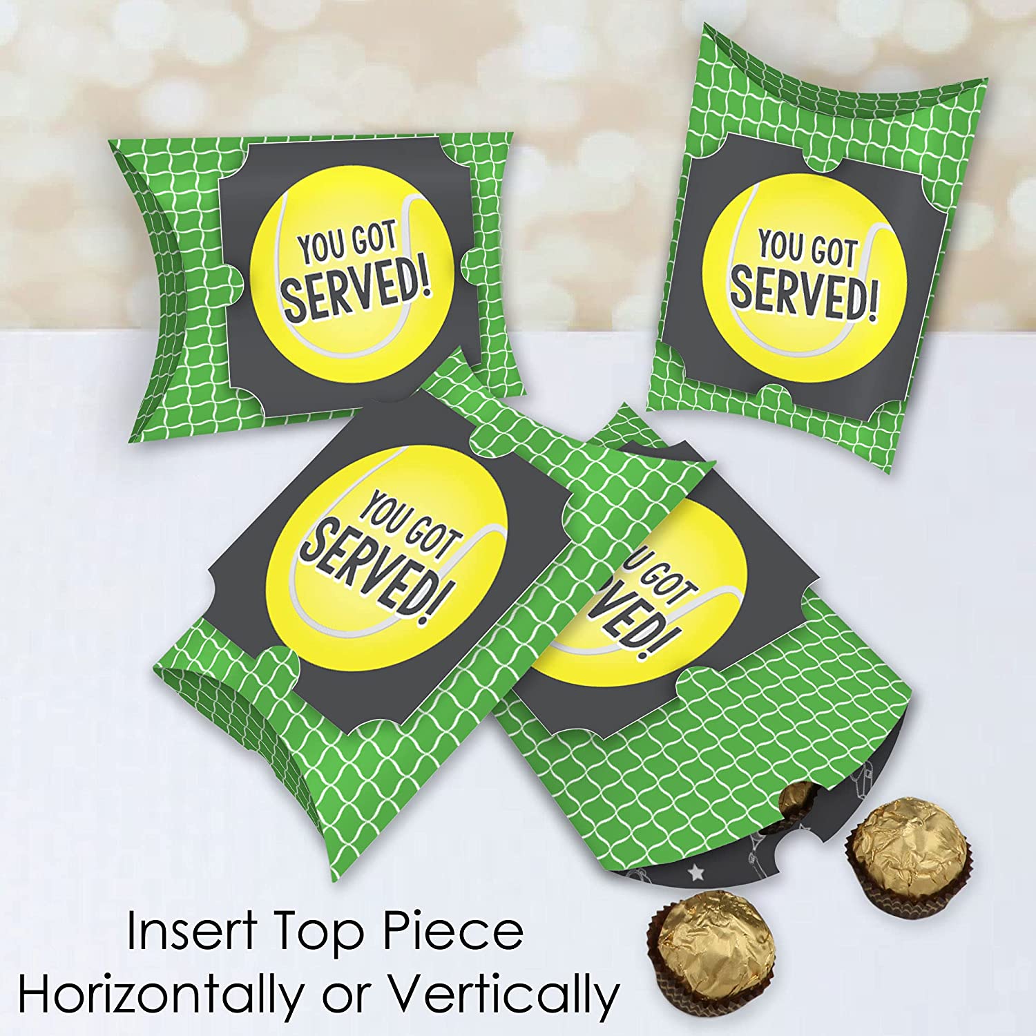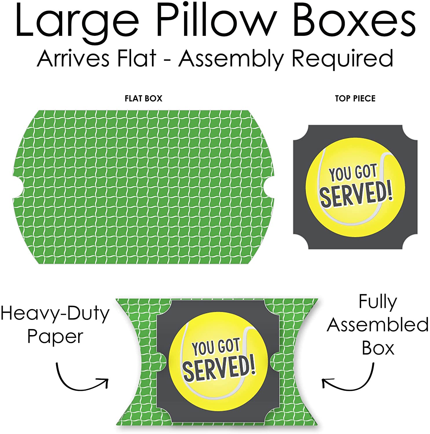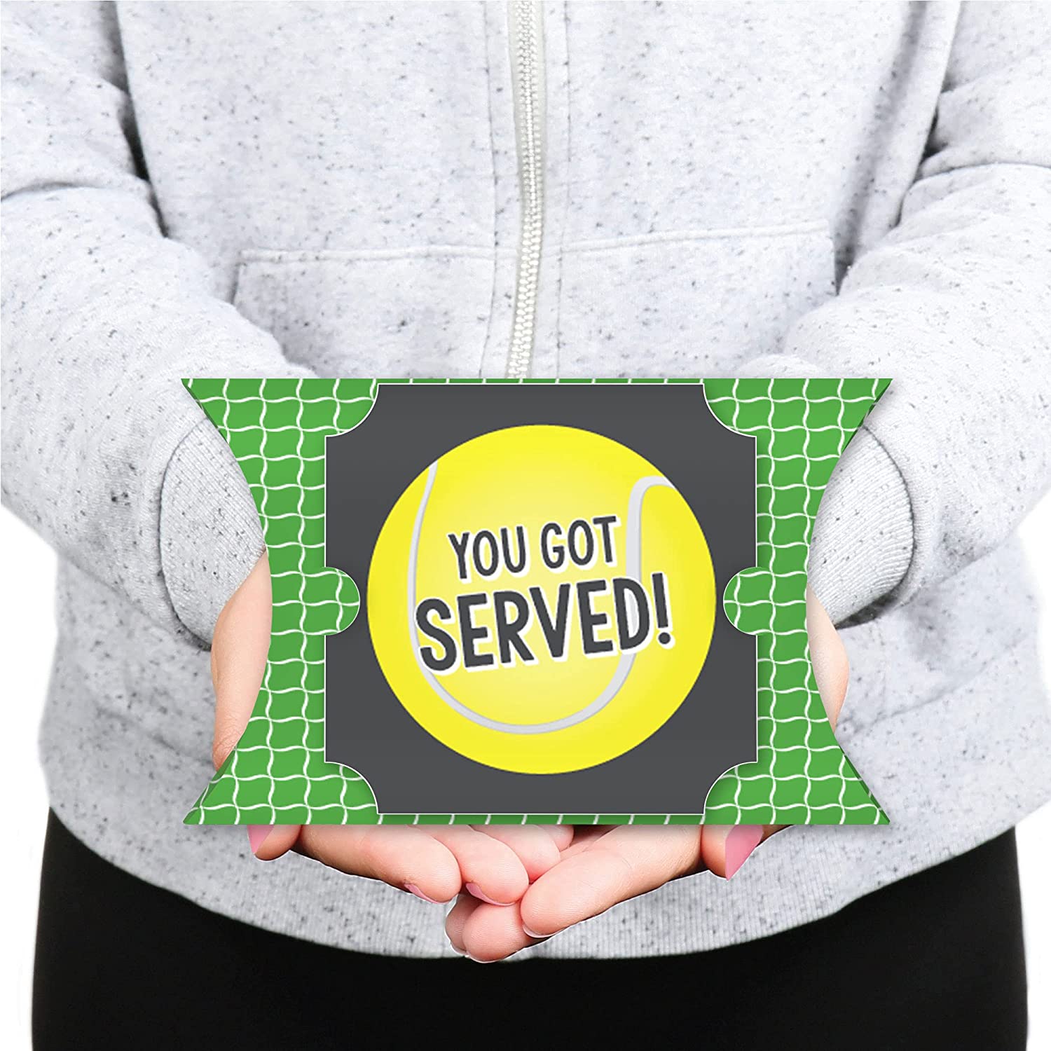 You Got Served - Tennis - Favor Gift Boxes - Baby Shower or Tennis Ball Birthday Party Large Pillow Boxes - Set of 12 is backordered and will ship as soon as it is back in stock.