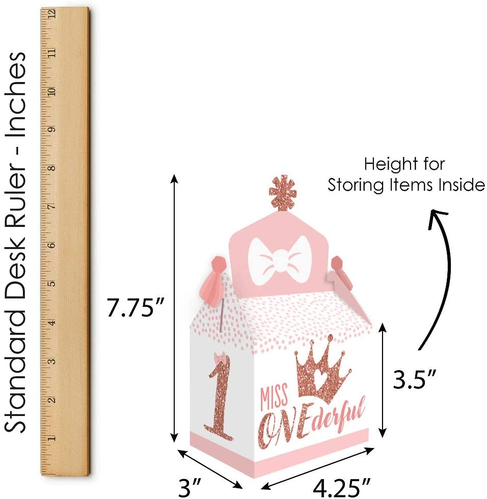 • Gable Boxes INCLUDE: 12 1st Birthday Little Miss Onederful-themed goodie party favor boxes. Each box SIZE measures 4.25 inches length x 3 inches width x 7.75 inches height. Gable favor boxes are ideal for small gifts and treats that are under 3.5 inches tall (height for storing items in closed box).