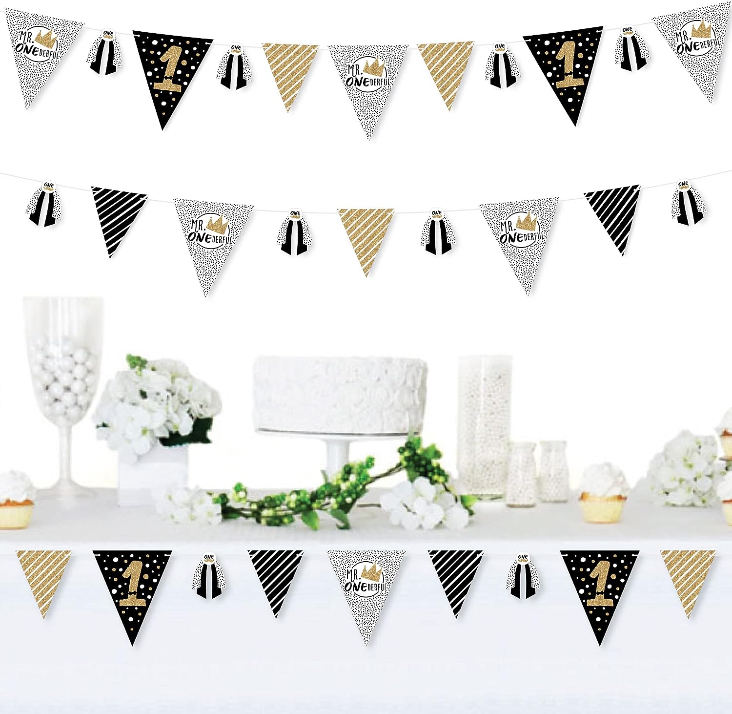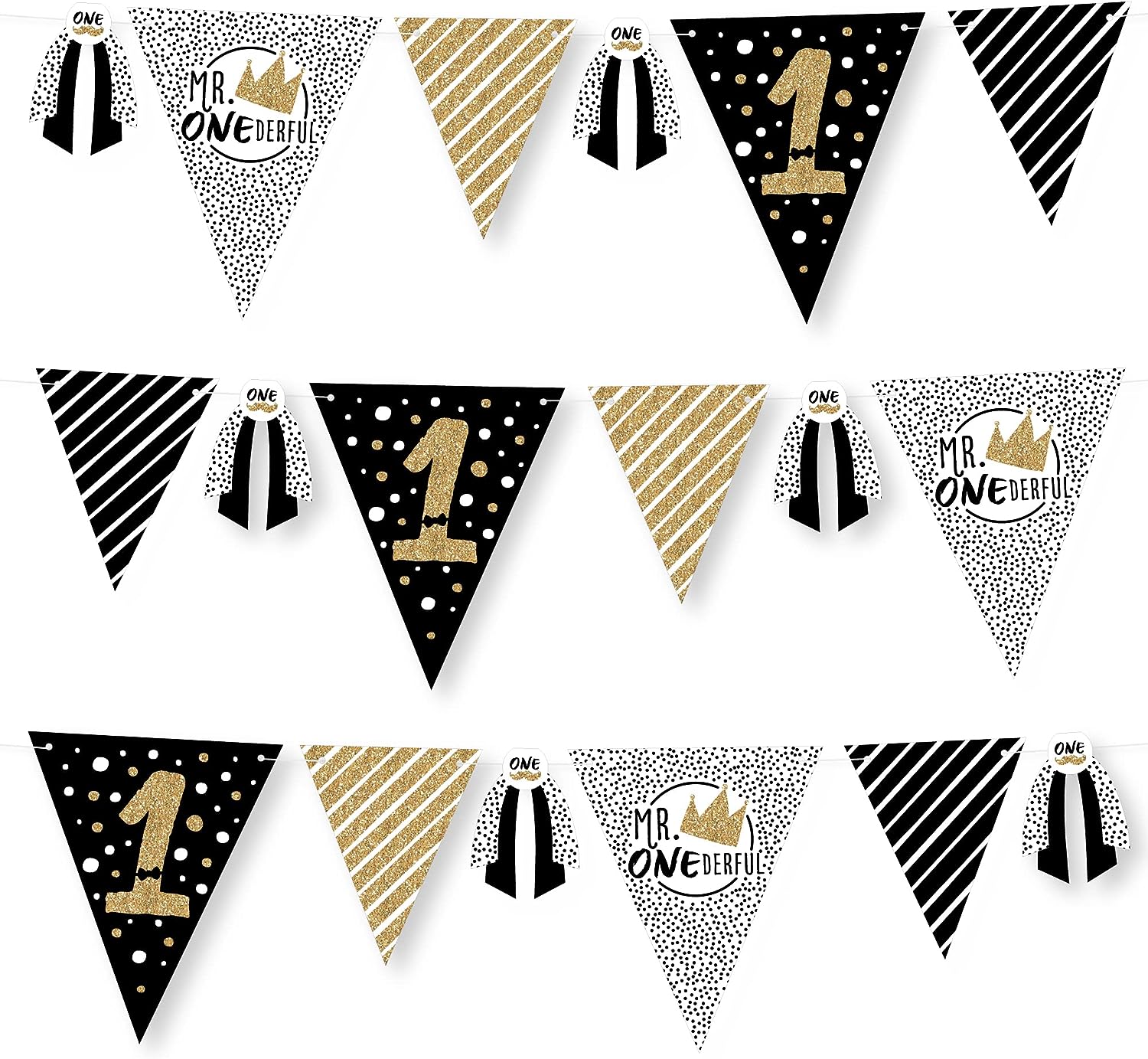 • 1st Birthday Little Mr. Onederful Triangle Banner includes a set of 20 paper triangle flags, 10 paper tassel shapes, satin cording, and adhesive stickers. Make a fun garland banner that will look amazing at your boy first birthday party.