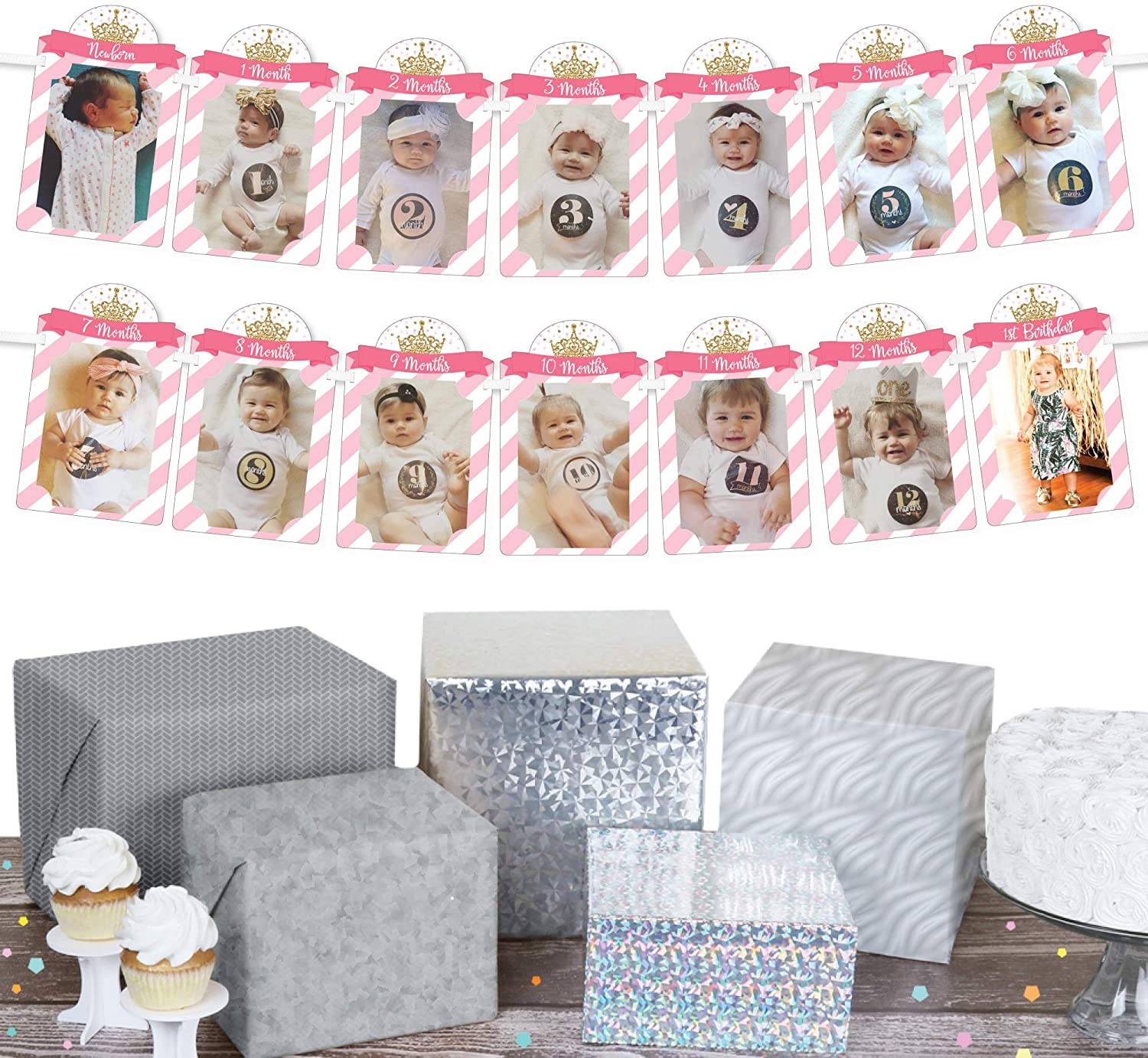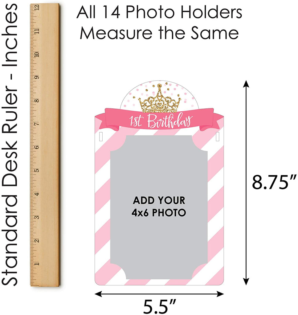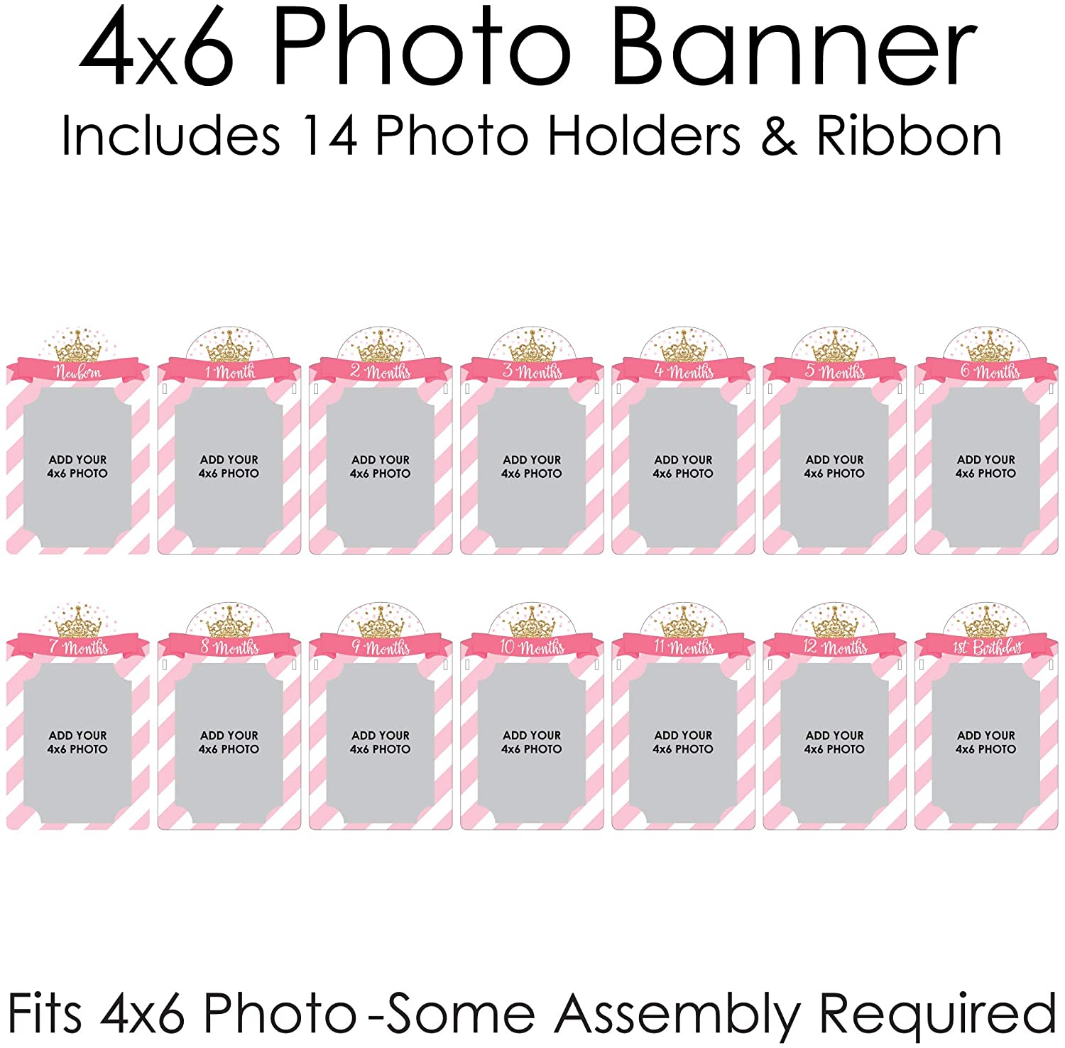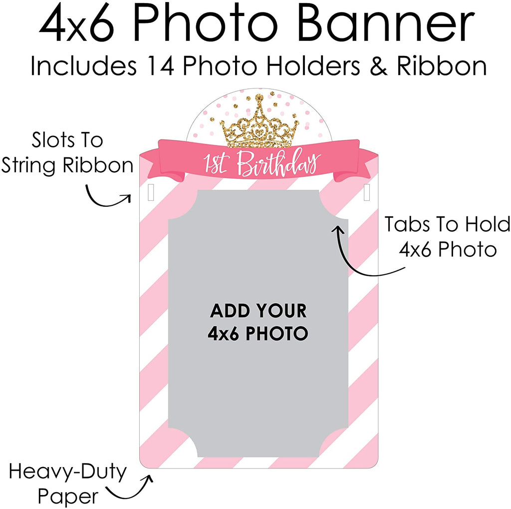 • 1st Birthday Little Princess Crown Photo Banner INCLUDES 14 sturdy and professionally printed photo holders and ribbon for DIY hanging. Each photo holder has pre-cut tabs to display your 4x6 photos vertically. Some assembly required.
