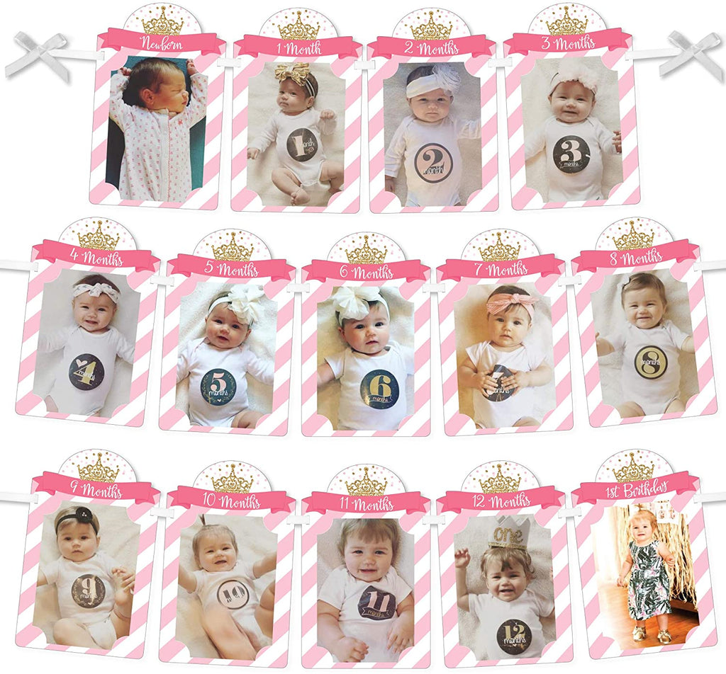 • DIY PICTURE BANNER: Put the guest of honor in the spotlight when you feature a 1-12 Monthly Picture Display. Each photo holder has two slots to string the included ribbon through and 4 pre-cut slits to tab your 4x6 photos vertically in place. Bonus: 1st Birthday Little Princess Crown Photo Banner is a damage free way to display your favorite picture display.