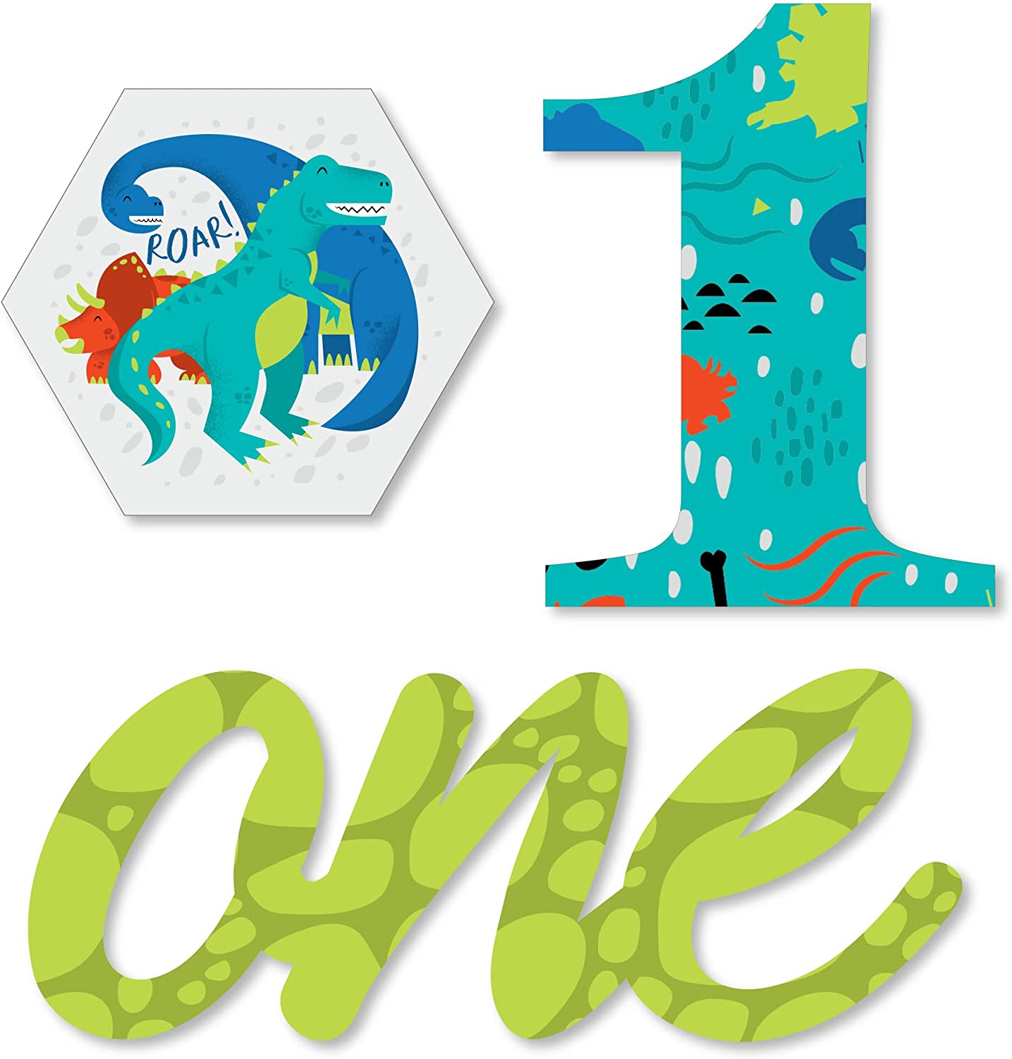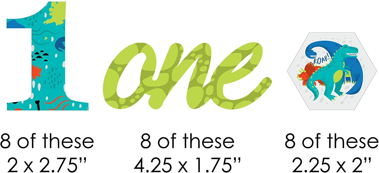 • DIY PARTY SUPPLIES: 1st Birthday Roar Dinosaur shaped cut outs include 24 paper die cuts in three different first birthday shapes that coordinate with the cute party theme. Set of 24 one shapes SIZE 8 # one paper die cuts (2” X 2.75”); 8 one (word) paper die cuts (4.25” x 1.75”); 8 hexagon paper die cuts (2.25” x 2”). The unique design makes these 1st bday party decorations a fun addition to any birthday party.