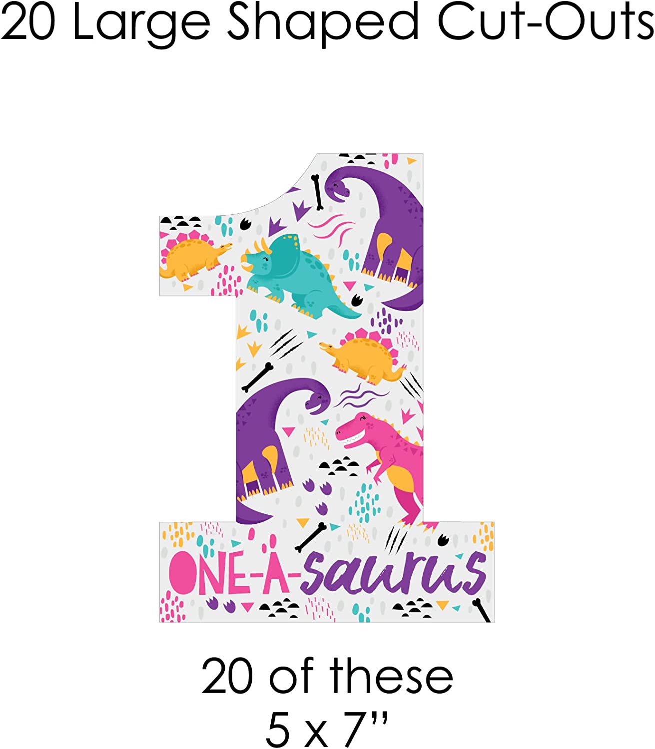 • DIY PARTY SUPPLIES: 1st Birthday Roar Dinosaur Girl small paper shaped cut-out SIZE 8 #One (2 inches x 2.75 inches), 8 One (words) (4.25 inches x 1.75 inches), 8 Hexagon (2.25 inches x 2 inches). 1st Birthday Roar Dinosaur Girl large paper shaped cut-outs SIZE 20 number one (5 inches x 7 inches).